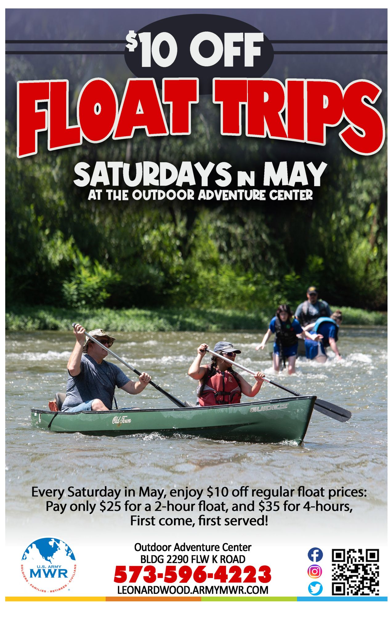 Every Saturday in May, enjoy $10 off regular float prices at Outdoor Adventure Center! Pay only $25 for a 2-hour float and $35 for 4 hours.