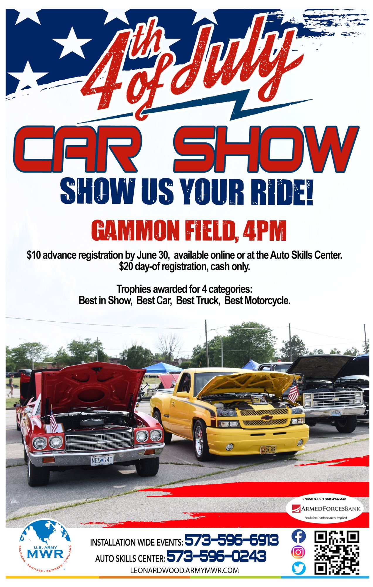 Register Now!Show us your ride! The 4th of July Car Show will be held at Gammon Field.