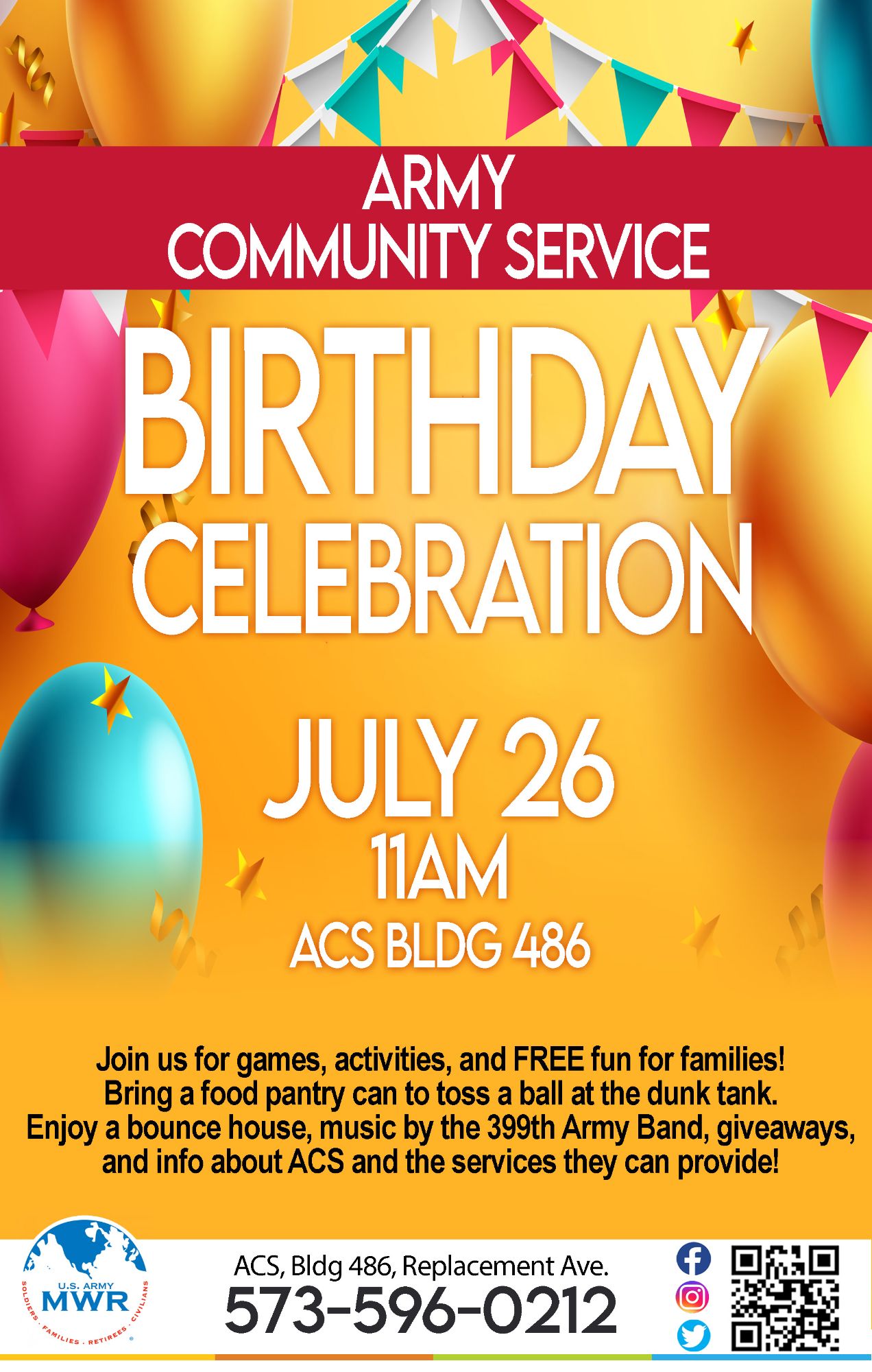 Enjoy a bounce house, activities, music by the 399th Army Band, giveaways, and info about ACS and services they offer.