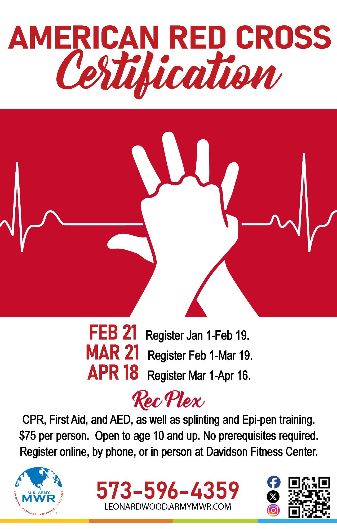Register Now!MWR is proud to provide CPR, First Aid, and AED Certification by the internationally recognized American Red Cross program. Course will be held at the Rec Plex. Patrons must attend full class to receive certification.