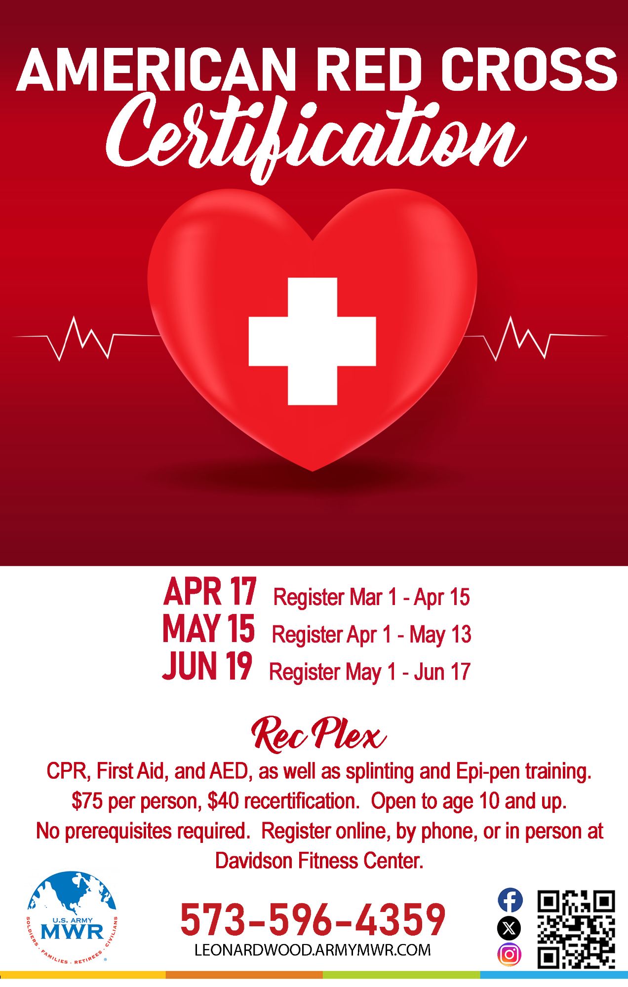 Register Now!Join us at the Rec Plex for American Red Cross Certification.