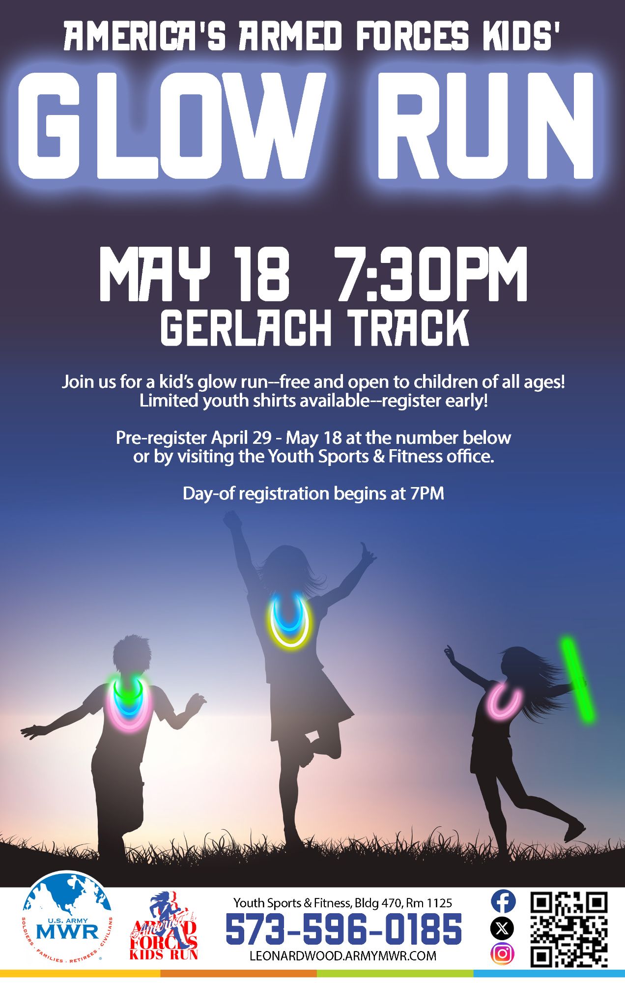 Join us for a kid's glow run for children of all ages! The America's Armed Forces Kids' Glow Run will be held at Gerlach Track.