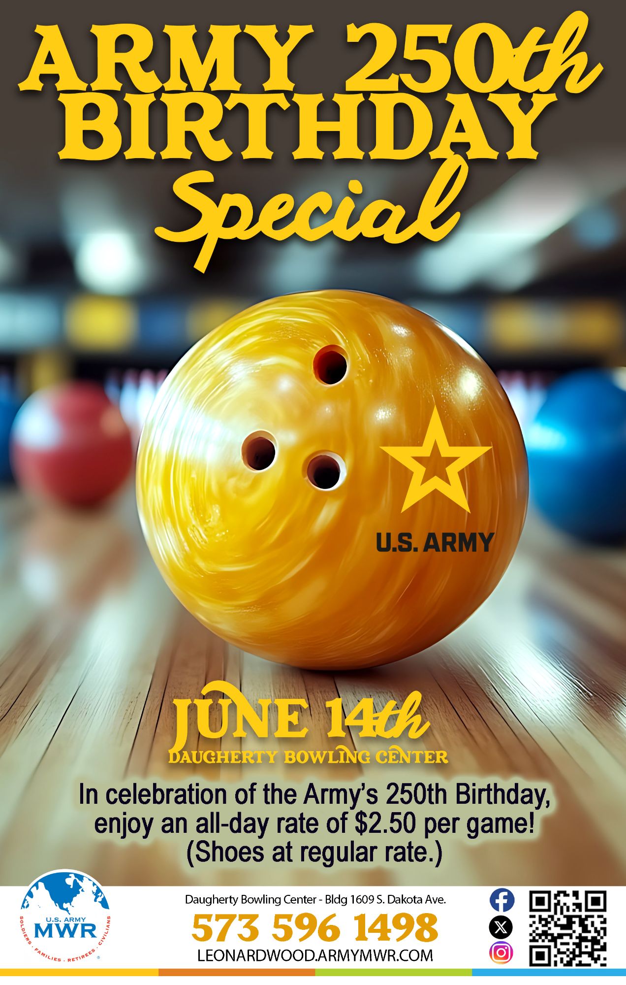 In celebration of the Army's 250th Birthday enjoy this all-day special at Daugherty Bowling Center!