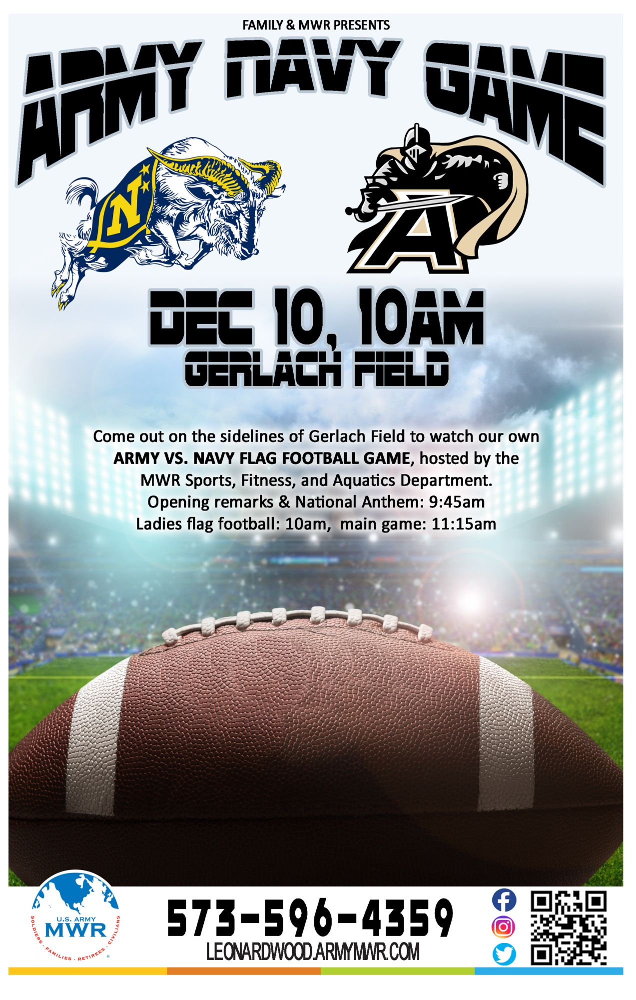 Come out to the sidelines of Gerlach Field to watch our own Army vs. Navy Flag Football Game, hosted by the MWR Sports, Fitness, and Aquatics Department!