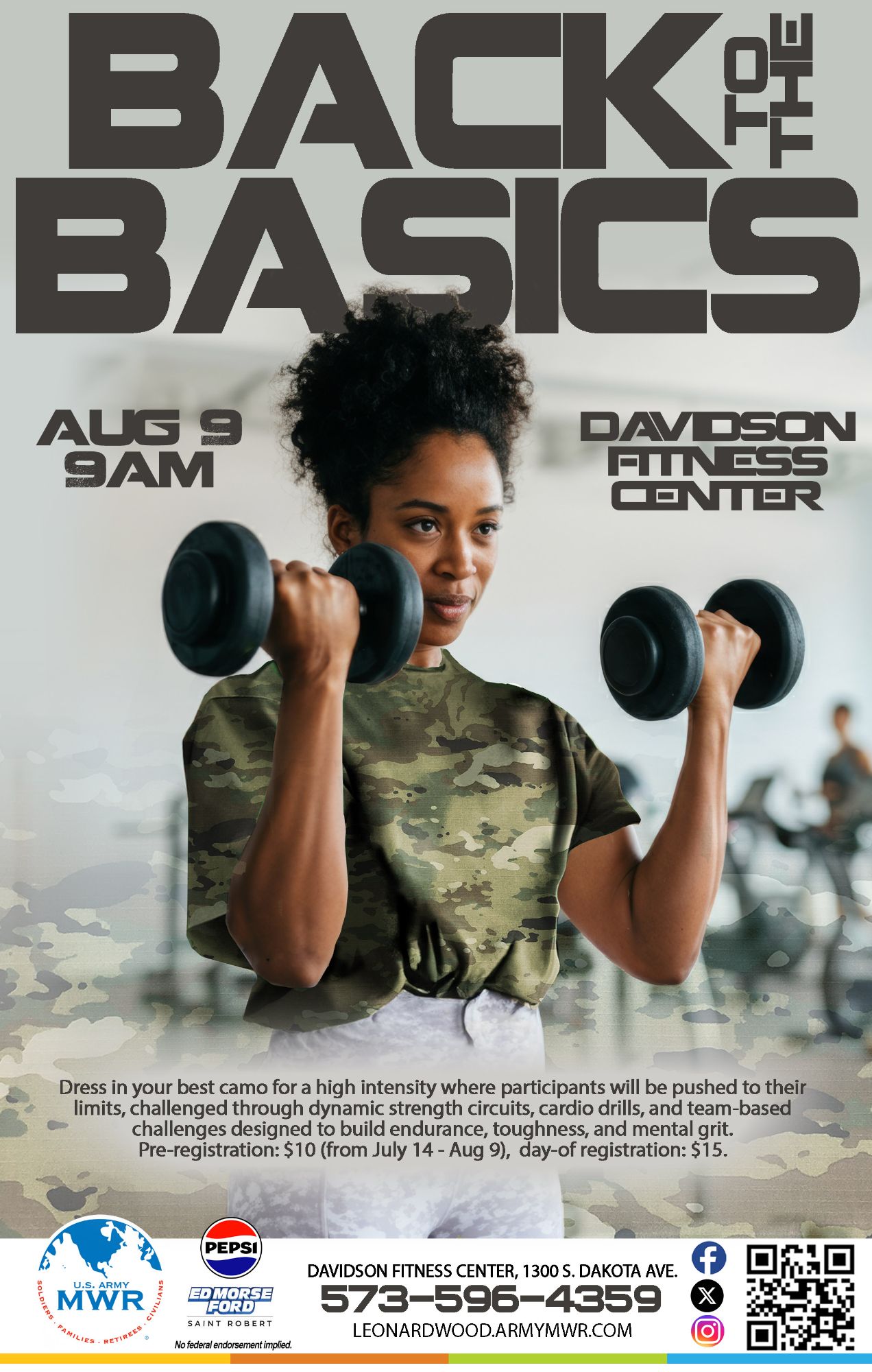 Dress in your best camo for this high intensity workout! Back to the Basics will be held at Davidson Fitness Center.