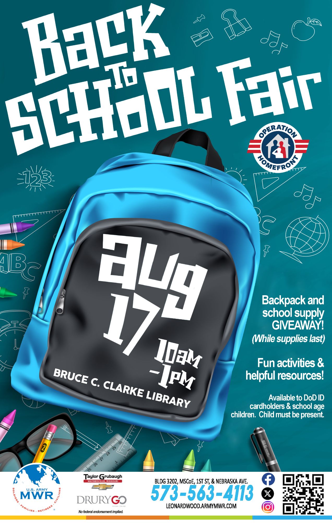 Giveaway is available while supplies last. Open to DoD ID card holders and their school age children. Child must be present.