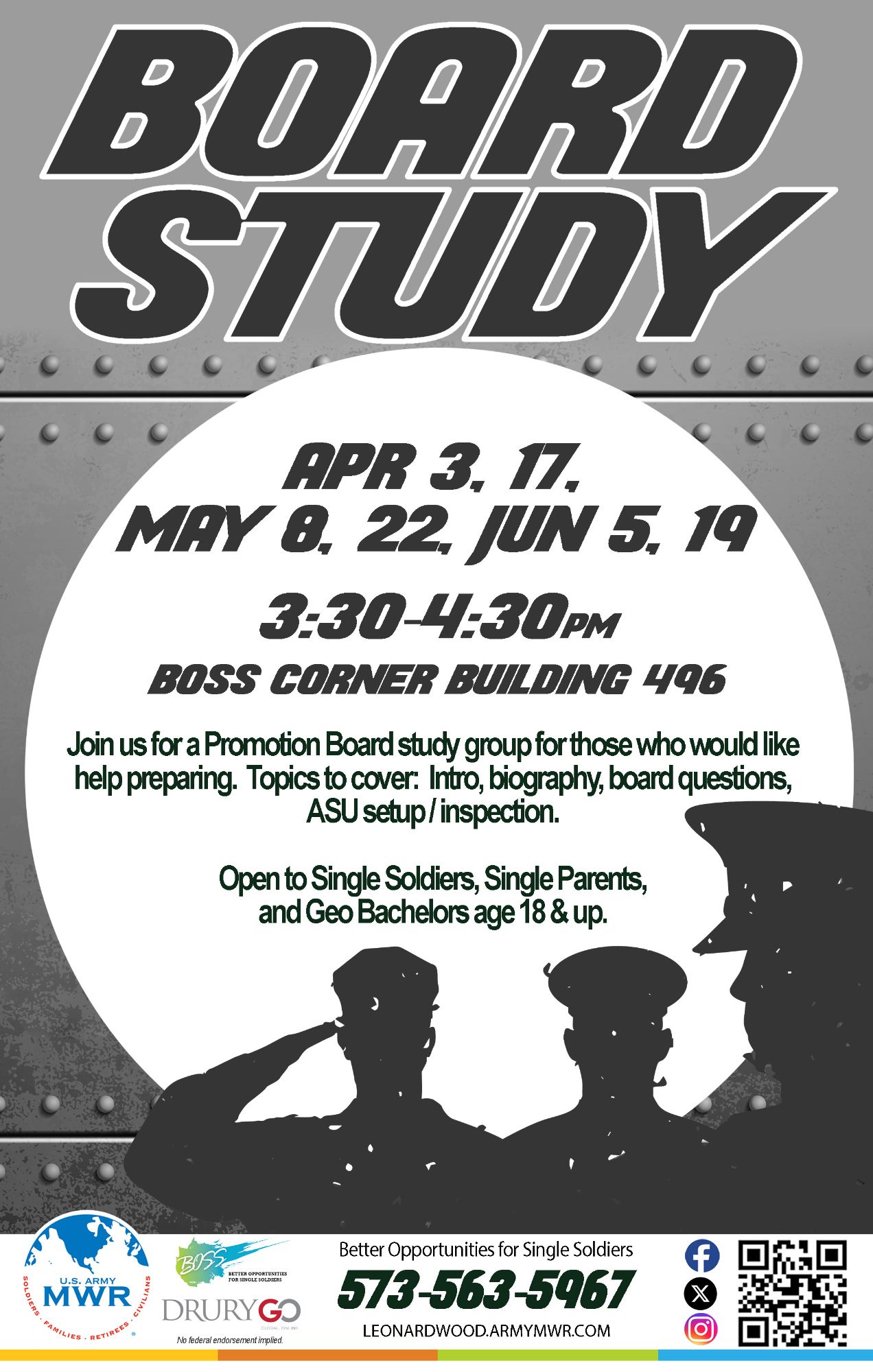 Join the BOSS Program for a Promotion Board study group for those who would like help preparing. Topics covered include: Intro, biography, board questions, ASU setup/inspection.