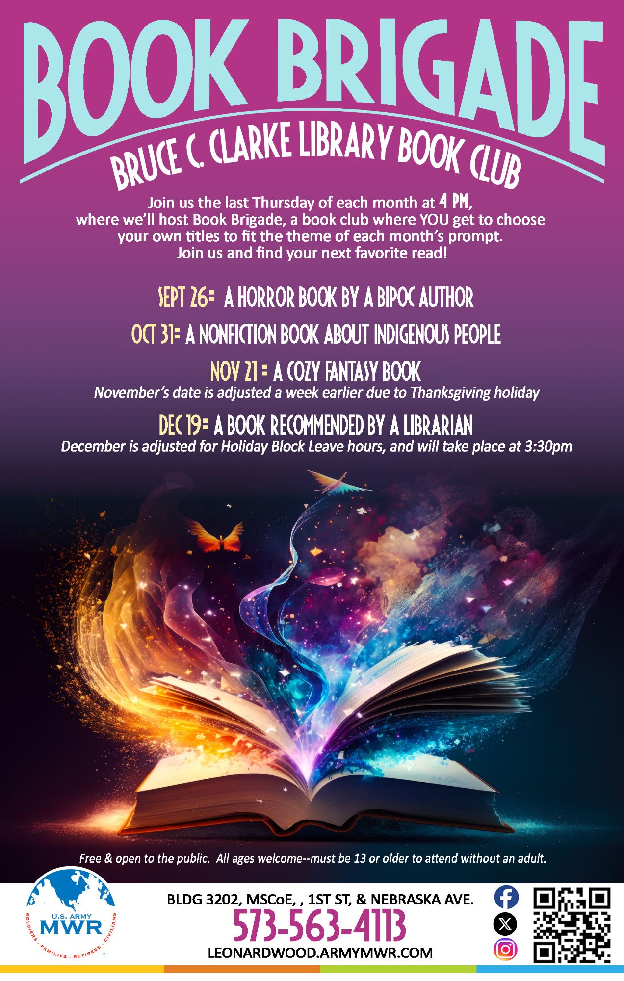 Join us at Bruce C. Clarke Library the last Thursday of each month for the Book Brigade! This is a book club where YOU get to choose your own titles to fit the theme of each month's prompt.