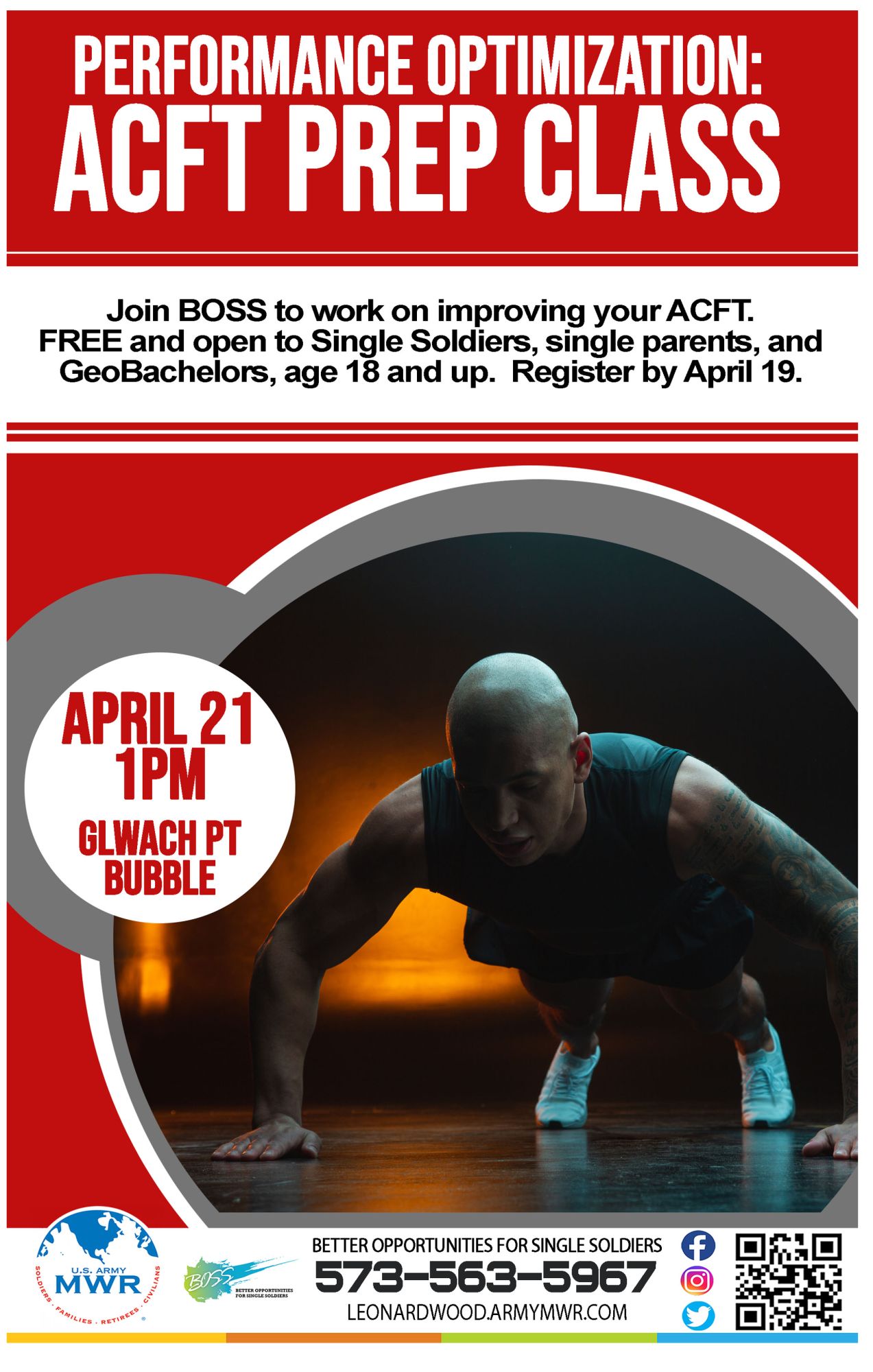 Join the BOSS Program for their Performance Optimization ACFT Prep Class which will be held at the GLWACH PT Bubble.