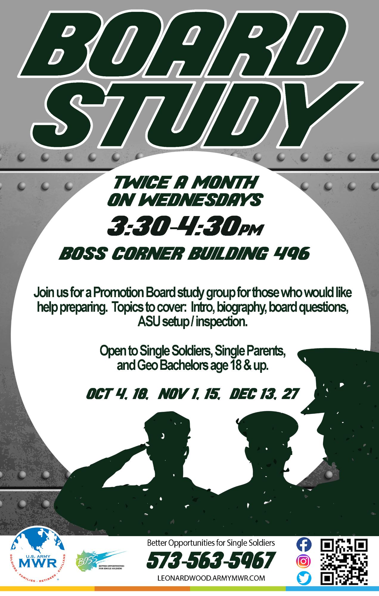 The Board Study will be held in the BOSS Corner twice a month on Wednesdays. Open to Single Soldiers, Single Parents, and Geo Bachelors ages 18 & up.