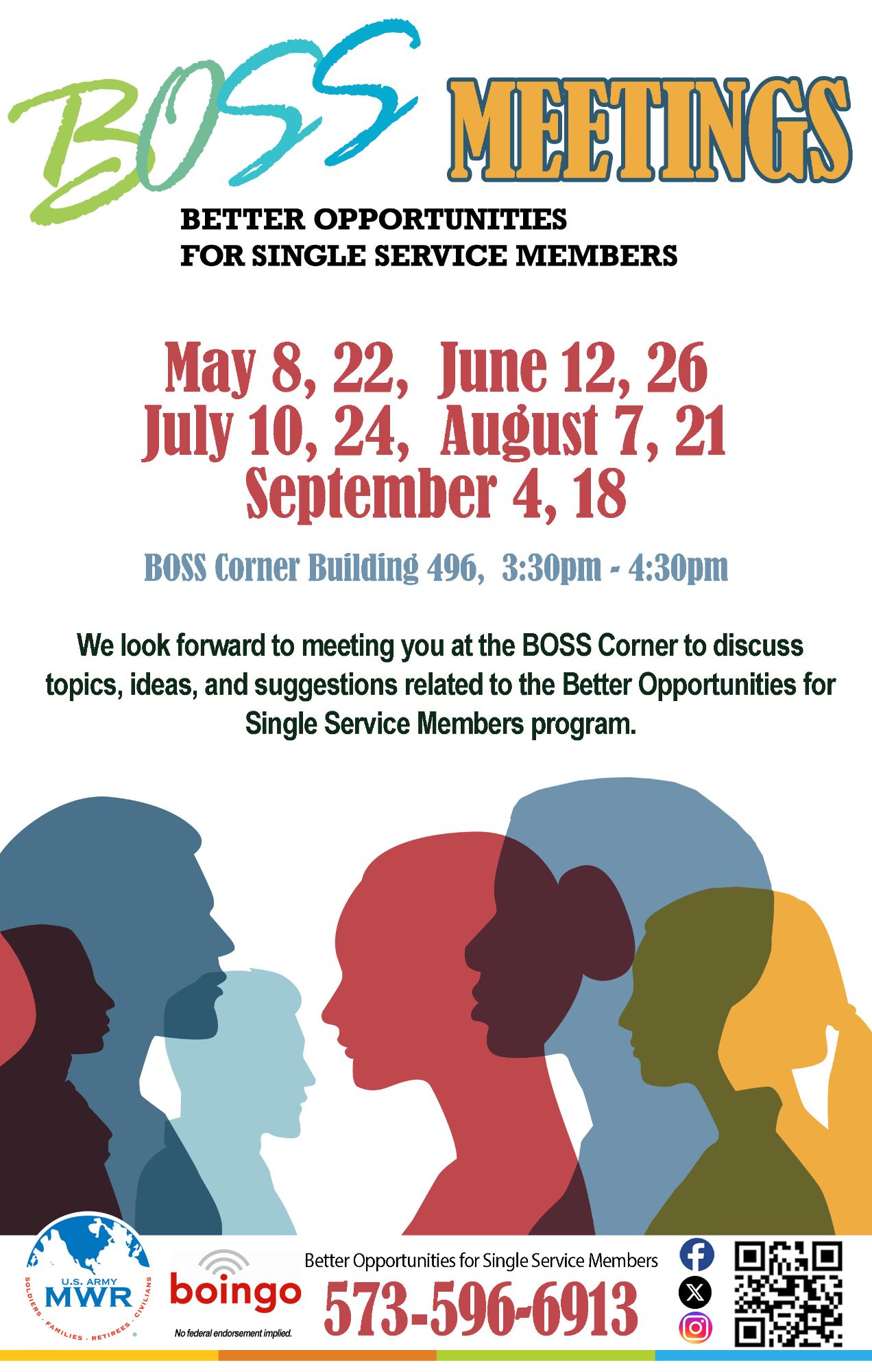 We look forward to meeting with you at the BOSS Corner to discuss topics, ideas, and suggestions related to the Better Opportunities for Single Service Members Program.