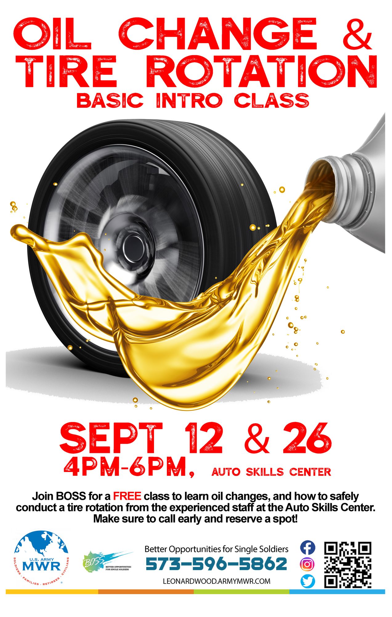 Join the Better Opportunities for Single Soldiers Program (BOSS) for a FREE class to learn oil changes and how to safely conduct a tire rotation!