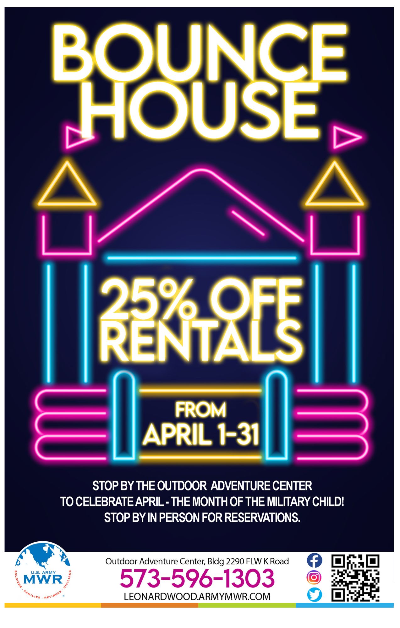 April is Month of the Military Child! In celebration, Outdoor Adventure Center is offering 25% off Bounce House Rentals all month long (during normal hours of operations).