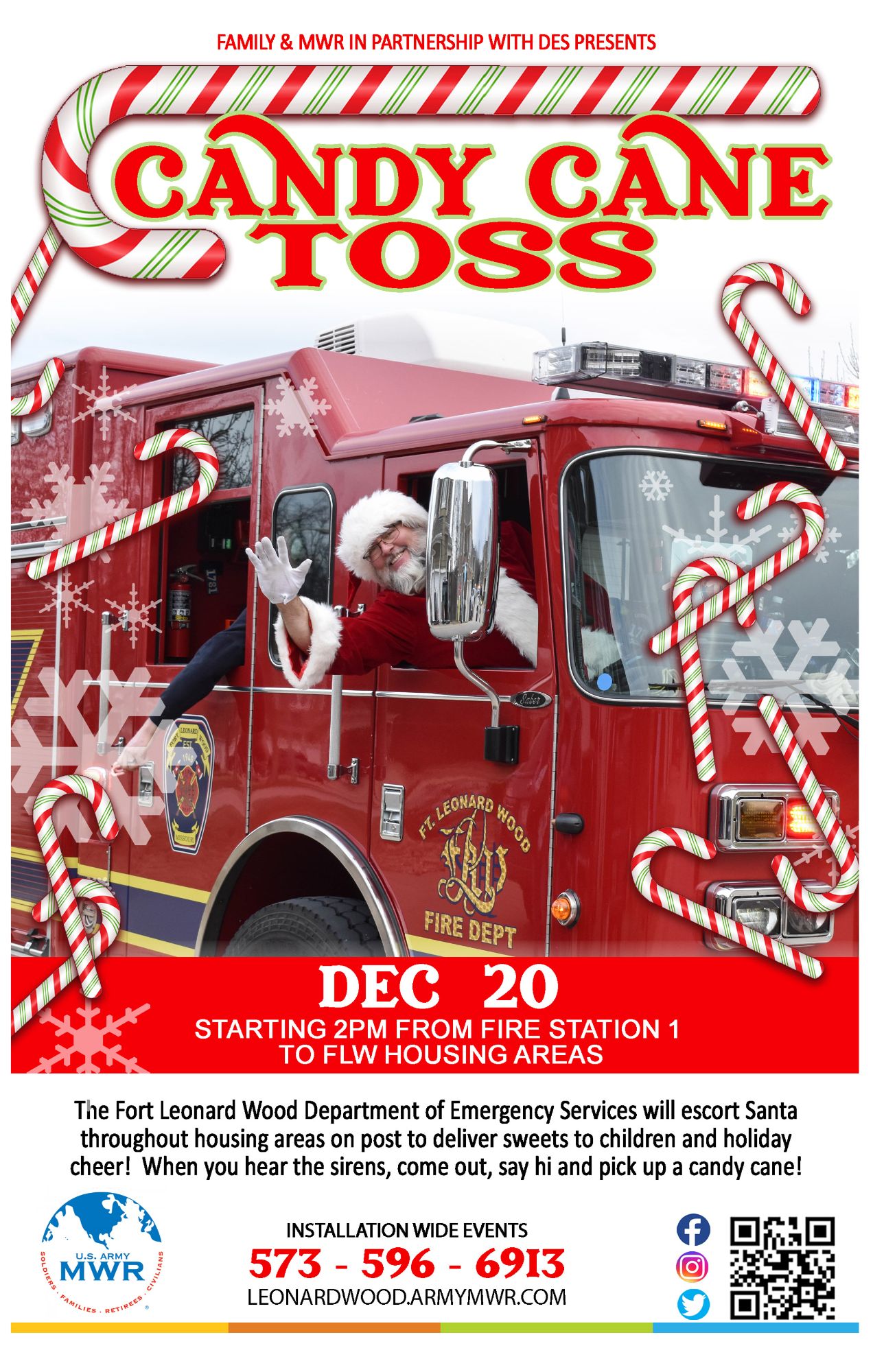 The Fort Leonard Wood Department of Emergency Services will escort Santa throughout the FLW housing areas to deliver sweets & holiday cheer to children!