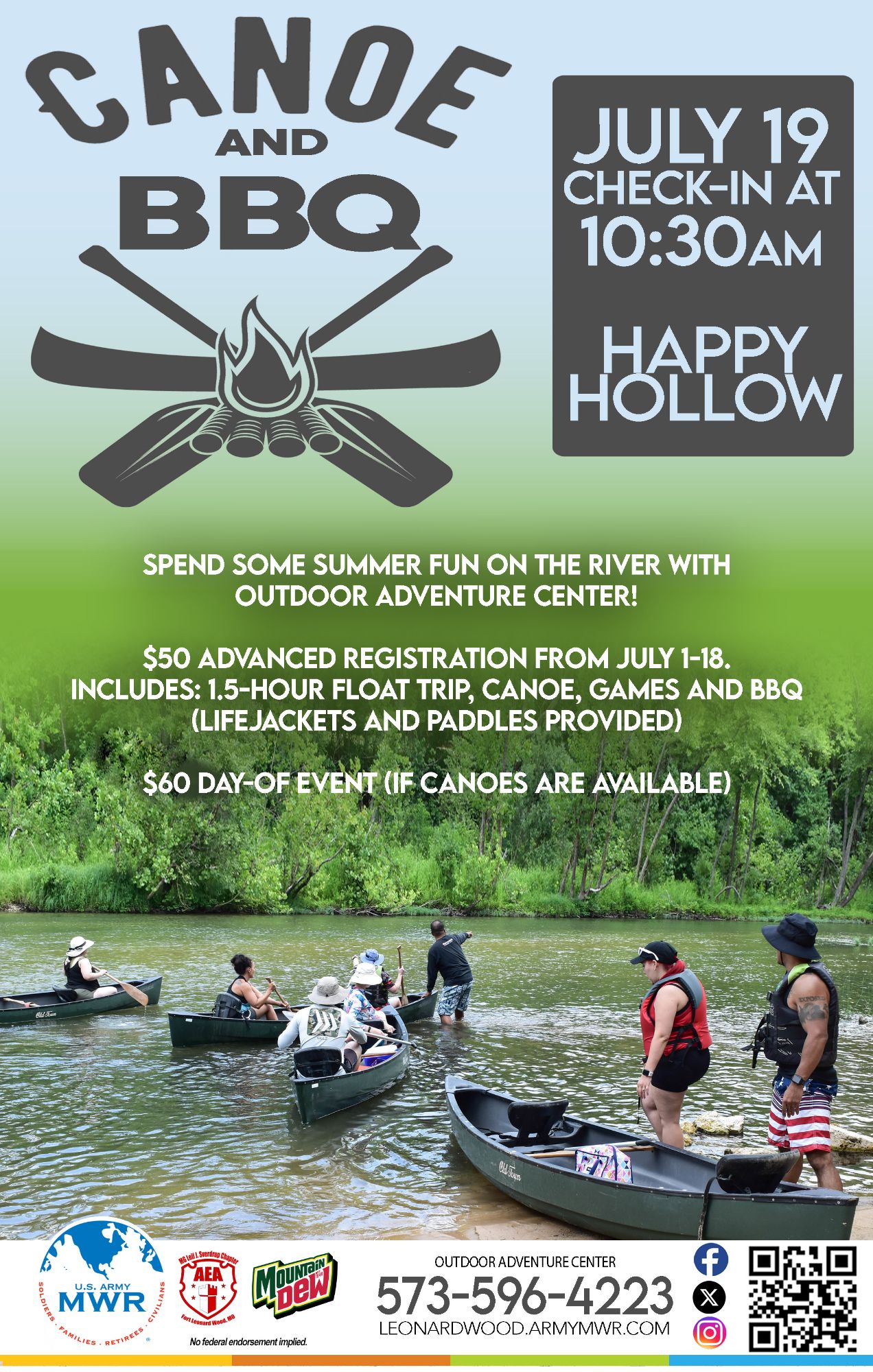 Cost includes 1.5 hour float trip, canoe, games, and BBQ. Lifejackets & paddles are provided.