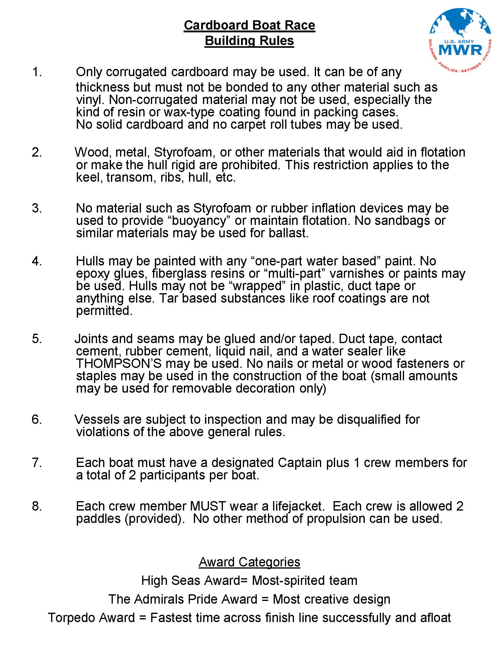 All boat construction must be completed prior to the event. Awards will be given for the most spirited team, most creative design, and first to cross the finish line afloat.