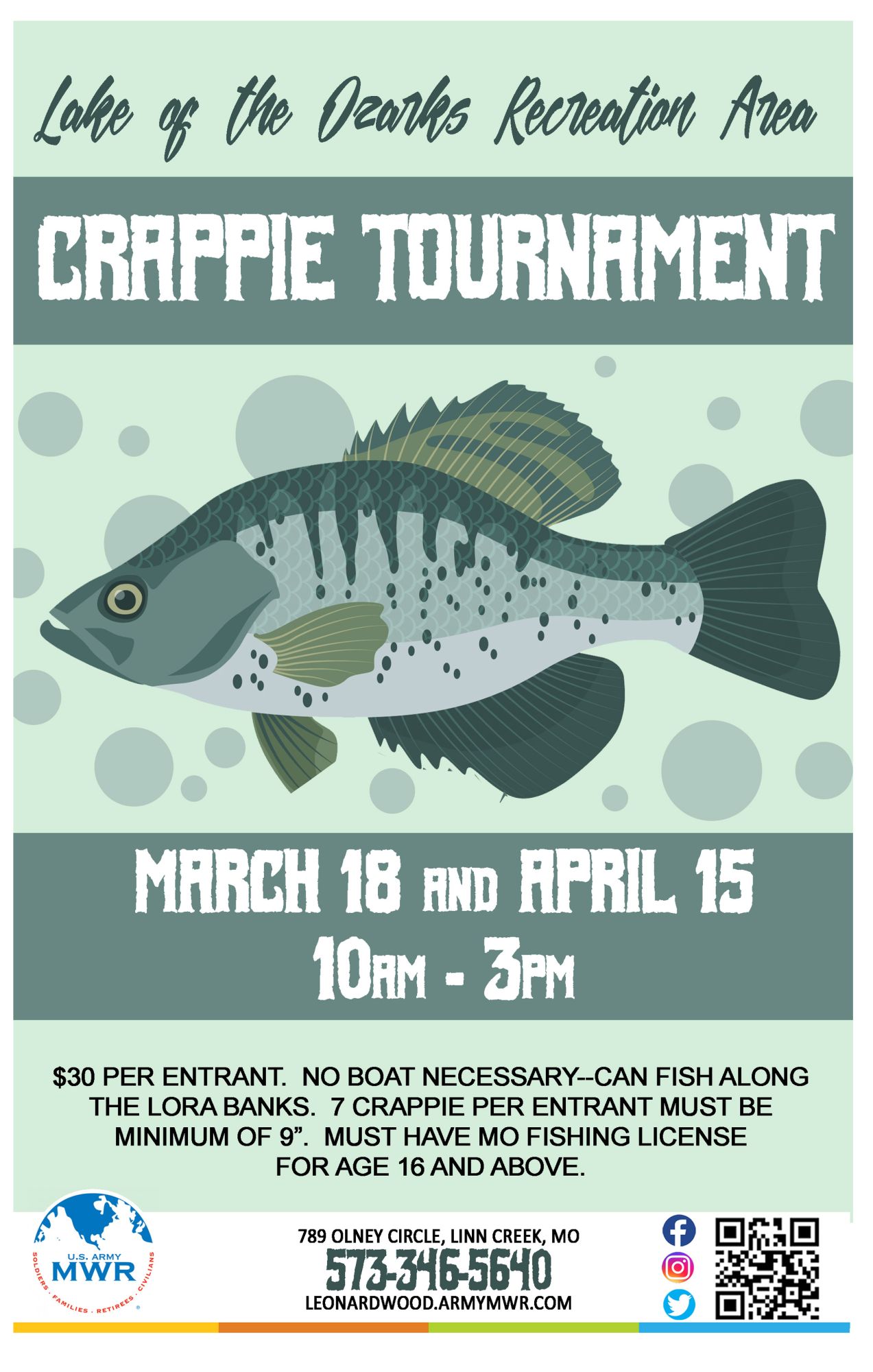 The Crappie Tournament will be held at the Lake of the Ozarks Recreation Area (LORA) on 18 March and 15 April.