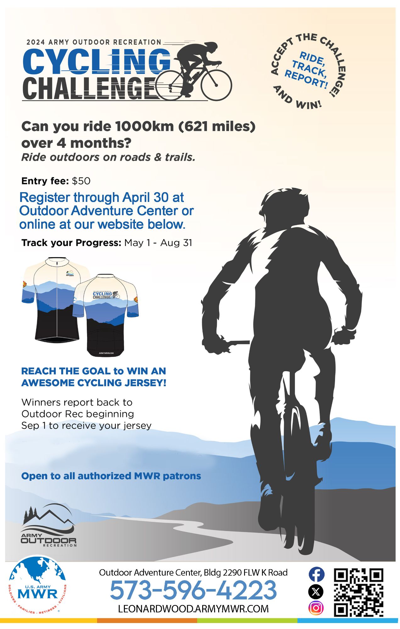 Can you ride 1000km (621 miles) over 4 months? Join the 2024 Army Outdoor Recreation Cycling Challenge to find out! Ride outdoors on roads & trails. Track your progress from 1 May - 31 August.