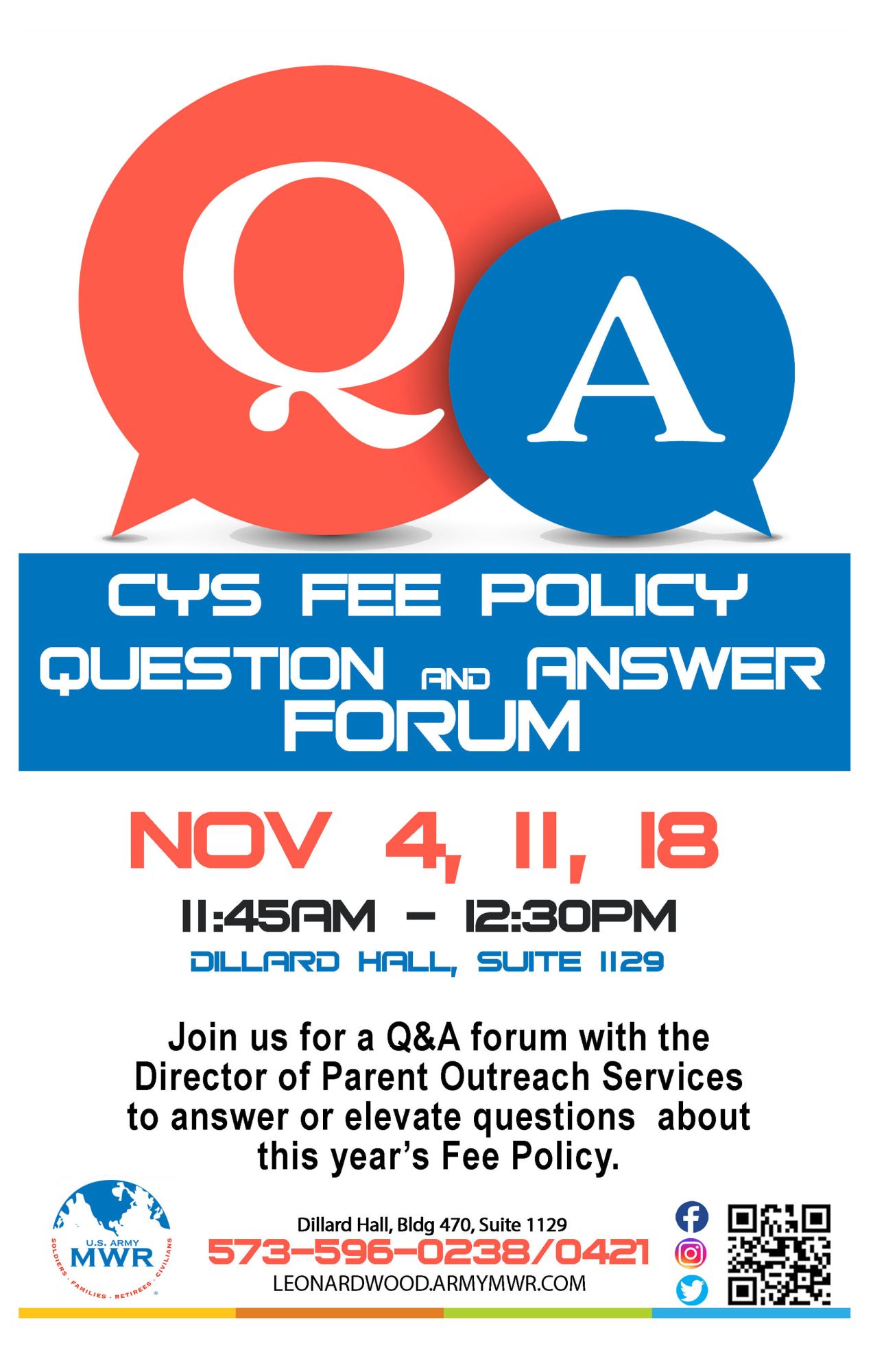 Join Fort Leonard Wood CYS for a Q&A Forum with the Director of Parent Outreach Services. This forum is designed to answer or elevate questions about this year's Fee Policy.
