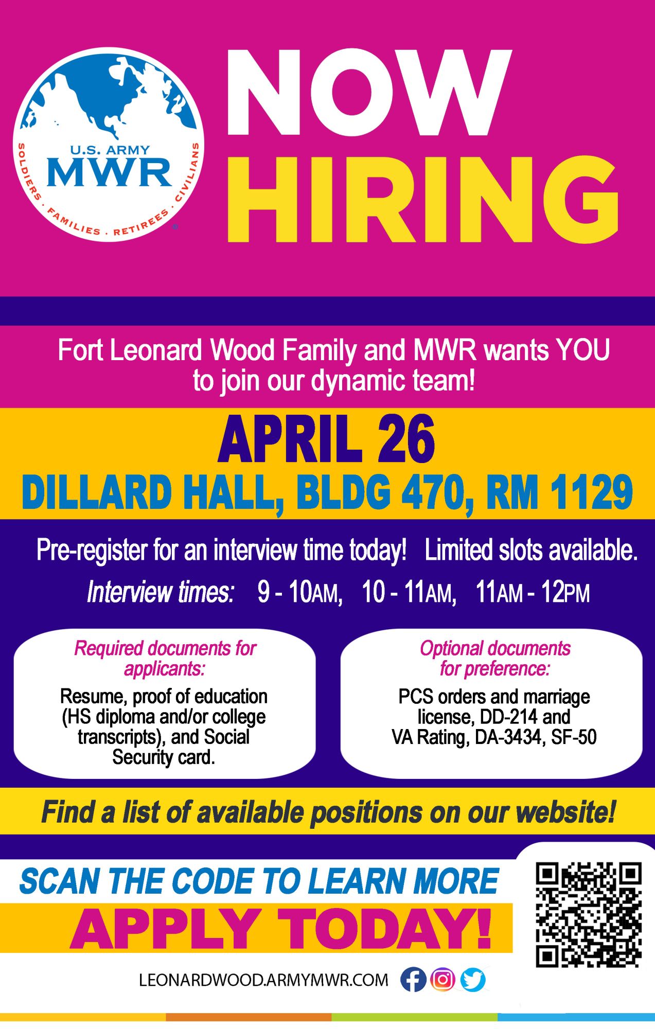 Register Now!Fort Leonard Wood Family & MWR wants YOU to join our dynamic team!