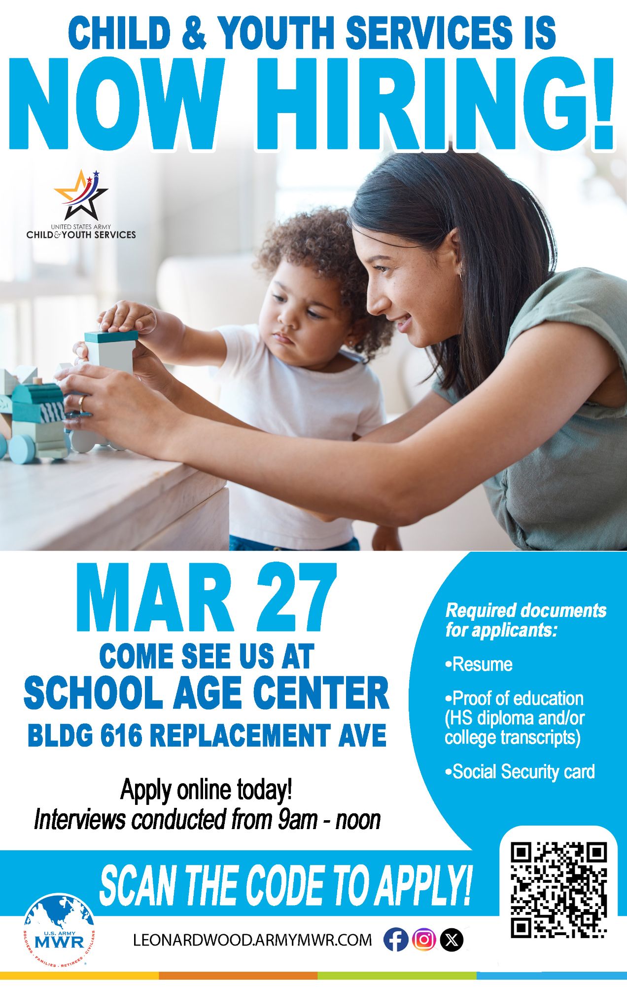 The Hiring Fair will be held at the School Age Center, Bldg 616.
