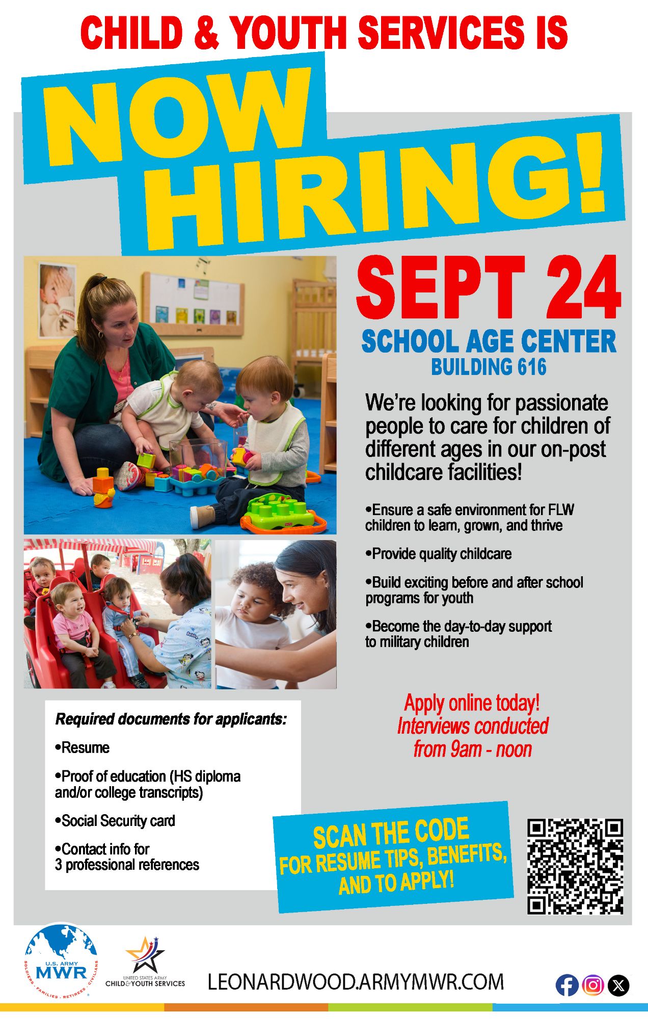 Fort Leonard Wood Child & Youth Services wants YOU to join our team! We're looking for passionate people to care for children of all ages in our on-post childcare and teen facilities.