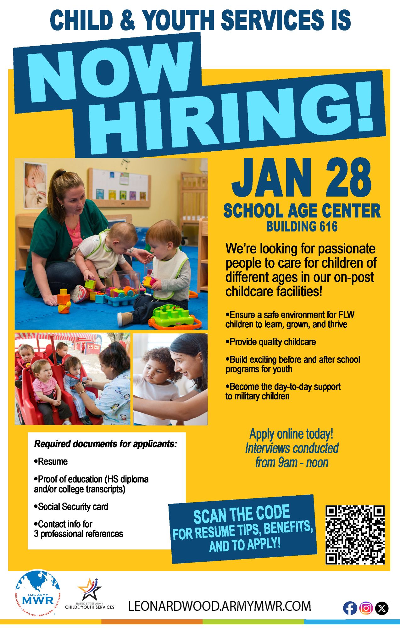 Fort Leonard Wood Child & Youth Services wants YOU to join our team! We're looking for passionate people to care for children of all ages in our on-post childcare and teen facilities.