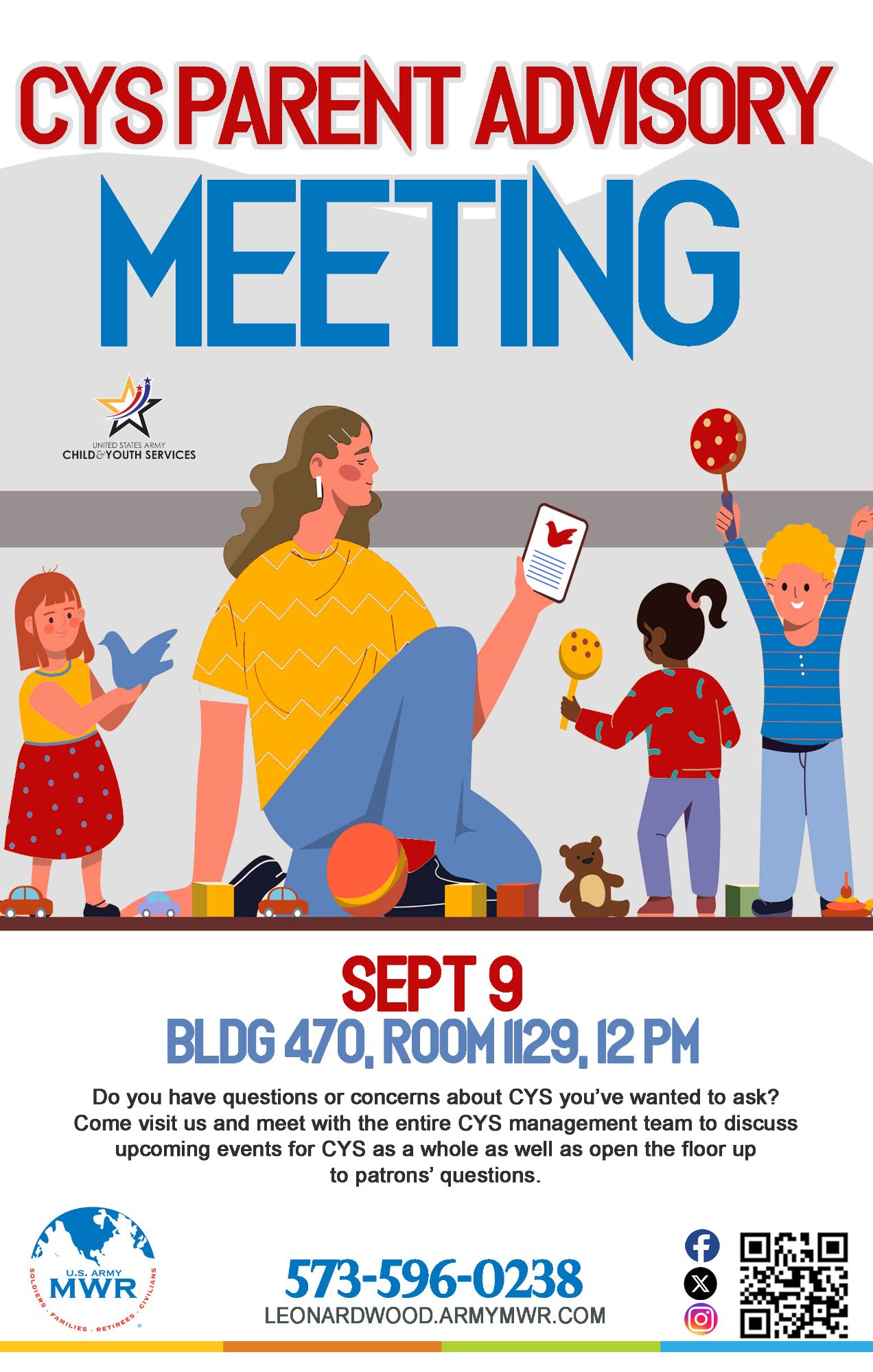 The CYS Parent Advisory Meeting will be held in Bldg 470, Rm 1129.