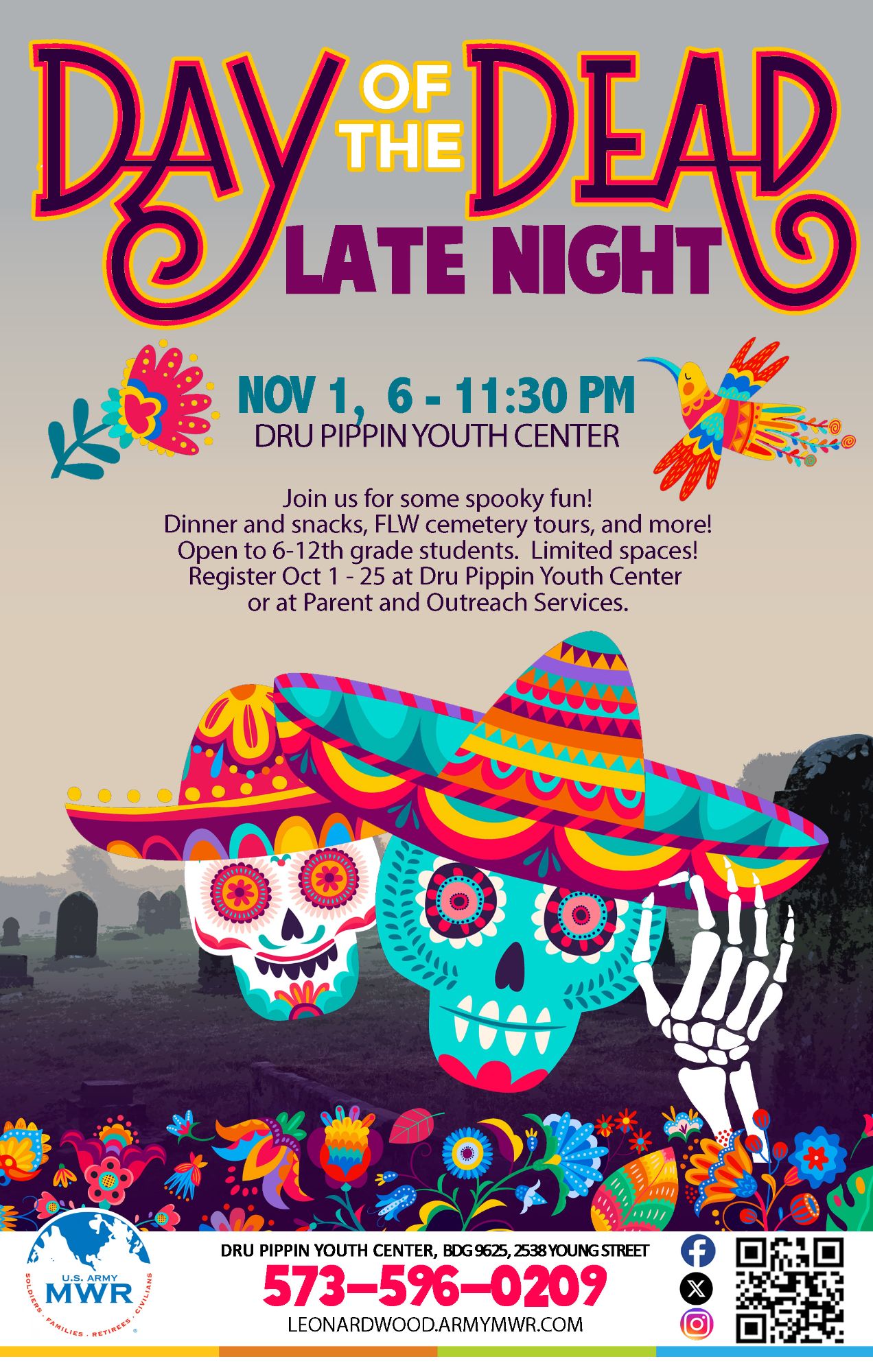 Join us at Dru Pippin Youth Center for some spooky fun during our Day of the Dead Late Night event! Enjoy dinner & snacks, FLW cemetery tours, and more!