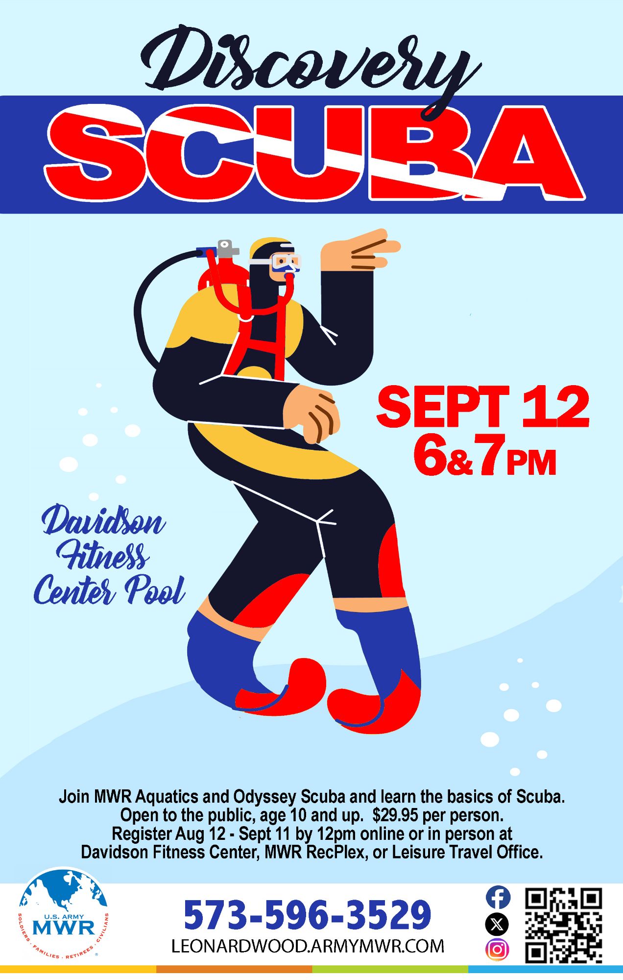 Join MWR and Odyssey Scuba to learn the basics of Scuba at Davidson Fitness Center Indoor Pool.