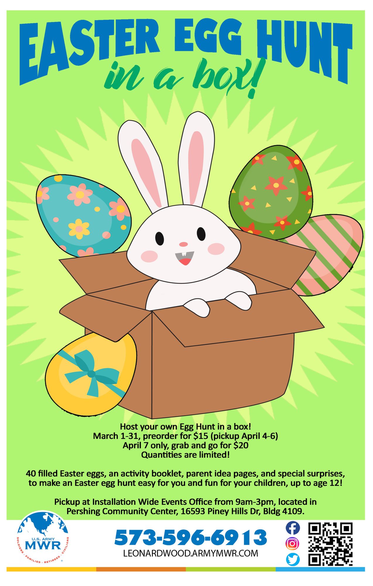 Register Now!Host your own Easter Egg Hunt with the help of Fort Leonard Wood MWR! Easter Egg Hunt in a Box makes an Easter egg hunt easy for you and fun for your children, up to age 12!