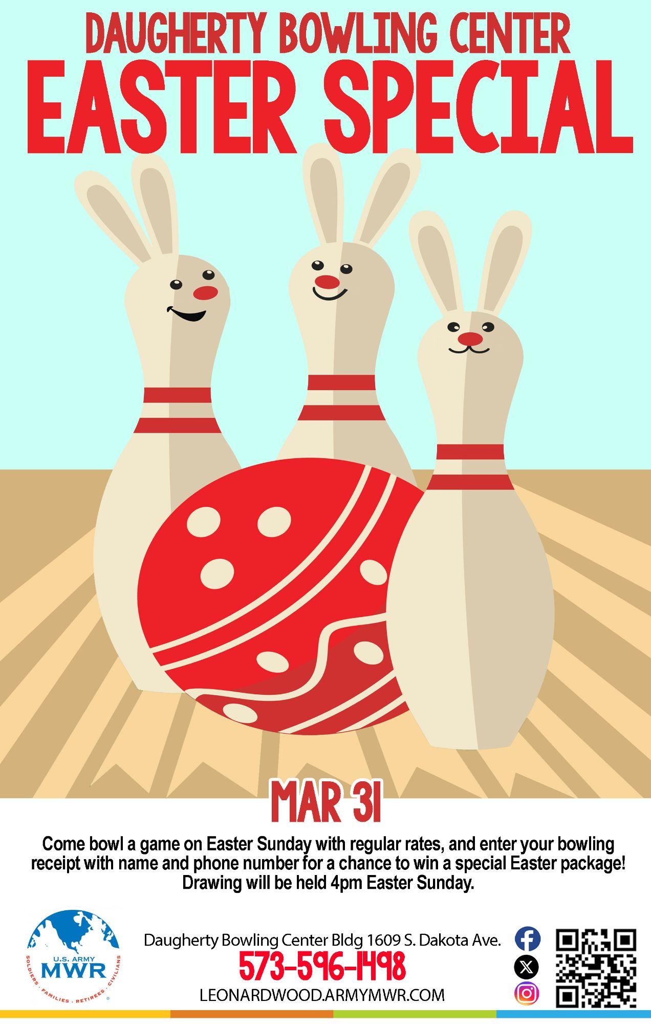 Come bowl a game at Daugherty Bowling Center on Easter Sunday with regular rates, and enter your bowling receipt for a chance to win a special Easter package!