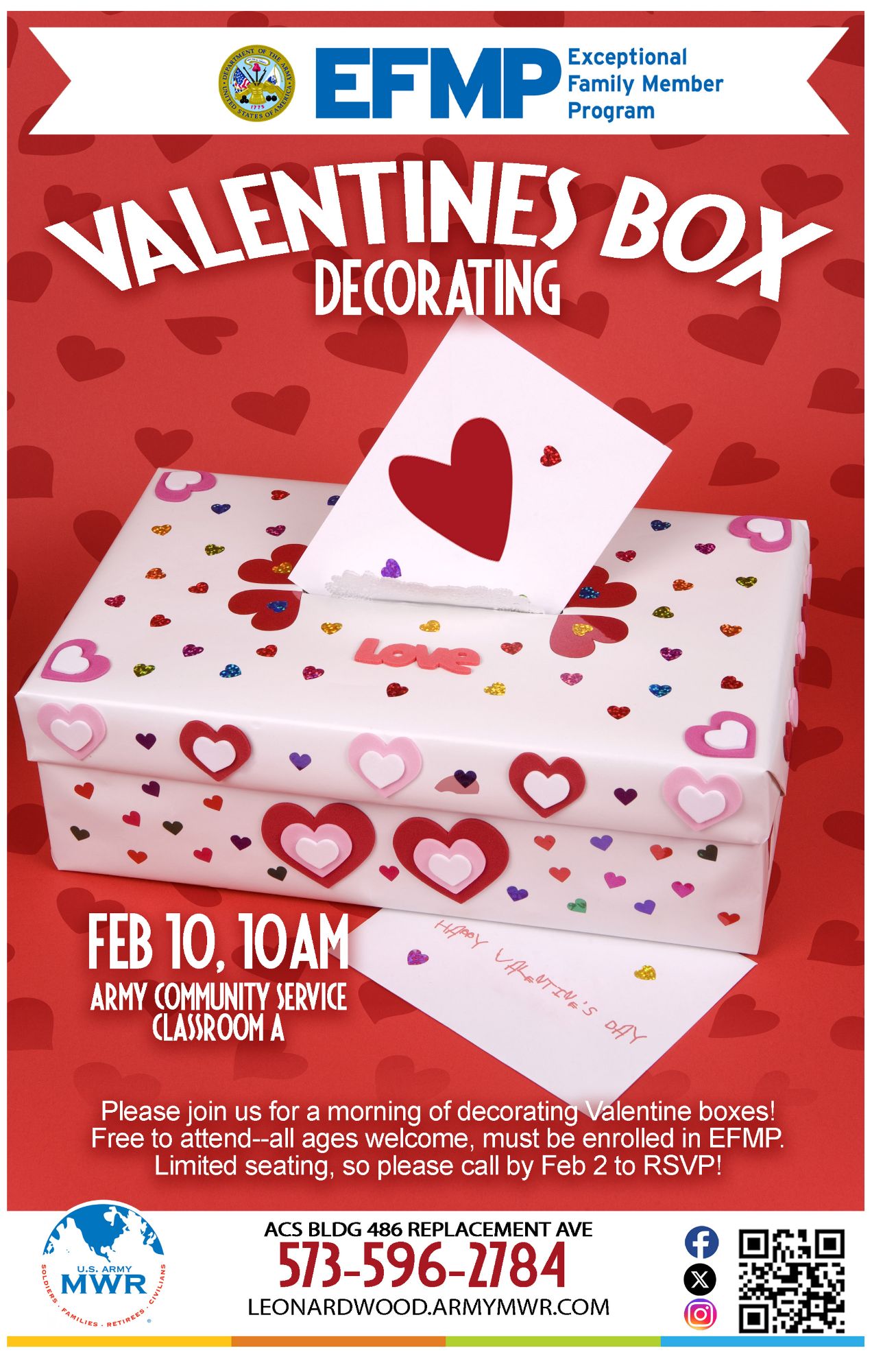 Please join us at Army Community Service for a morning of decorating Valentine boxes!