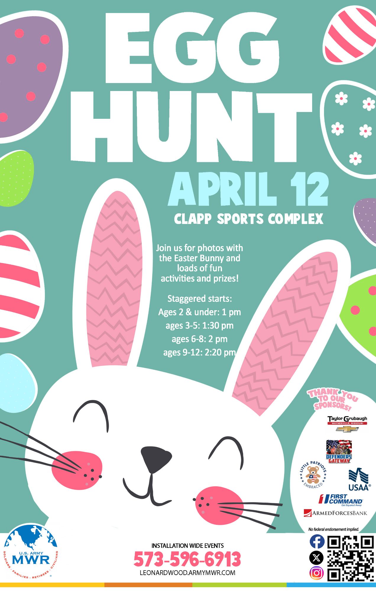 The Egg Hunt will be held at Clapp Sports Complex and will begin in staggered start times: