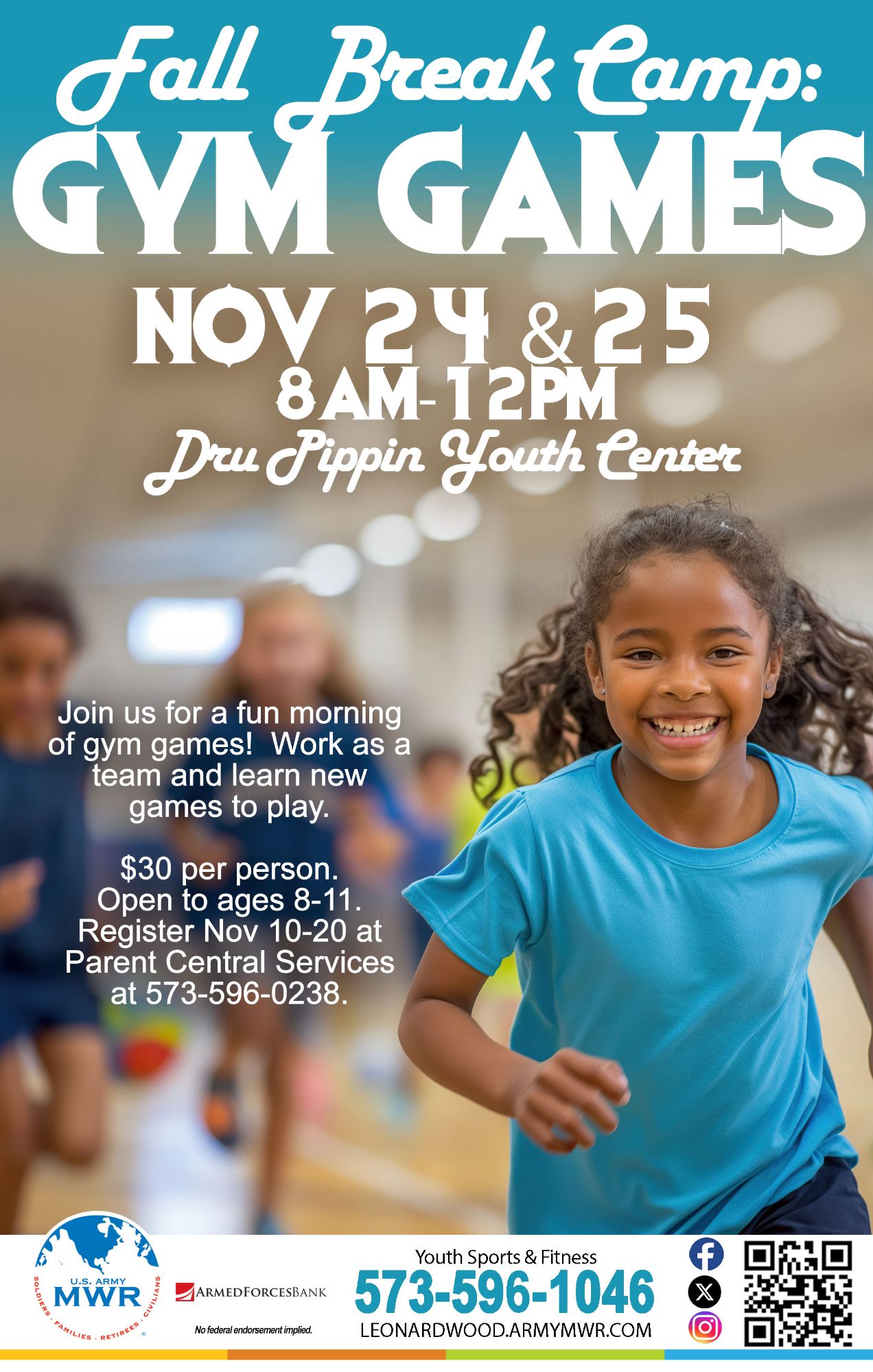 Fall Break Camp: Gym Games will be held on 24-25 November at Dru Pippin Youth Center.