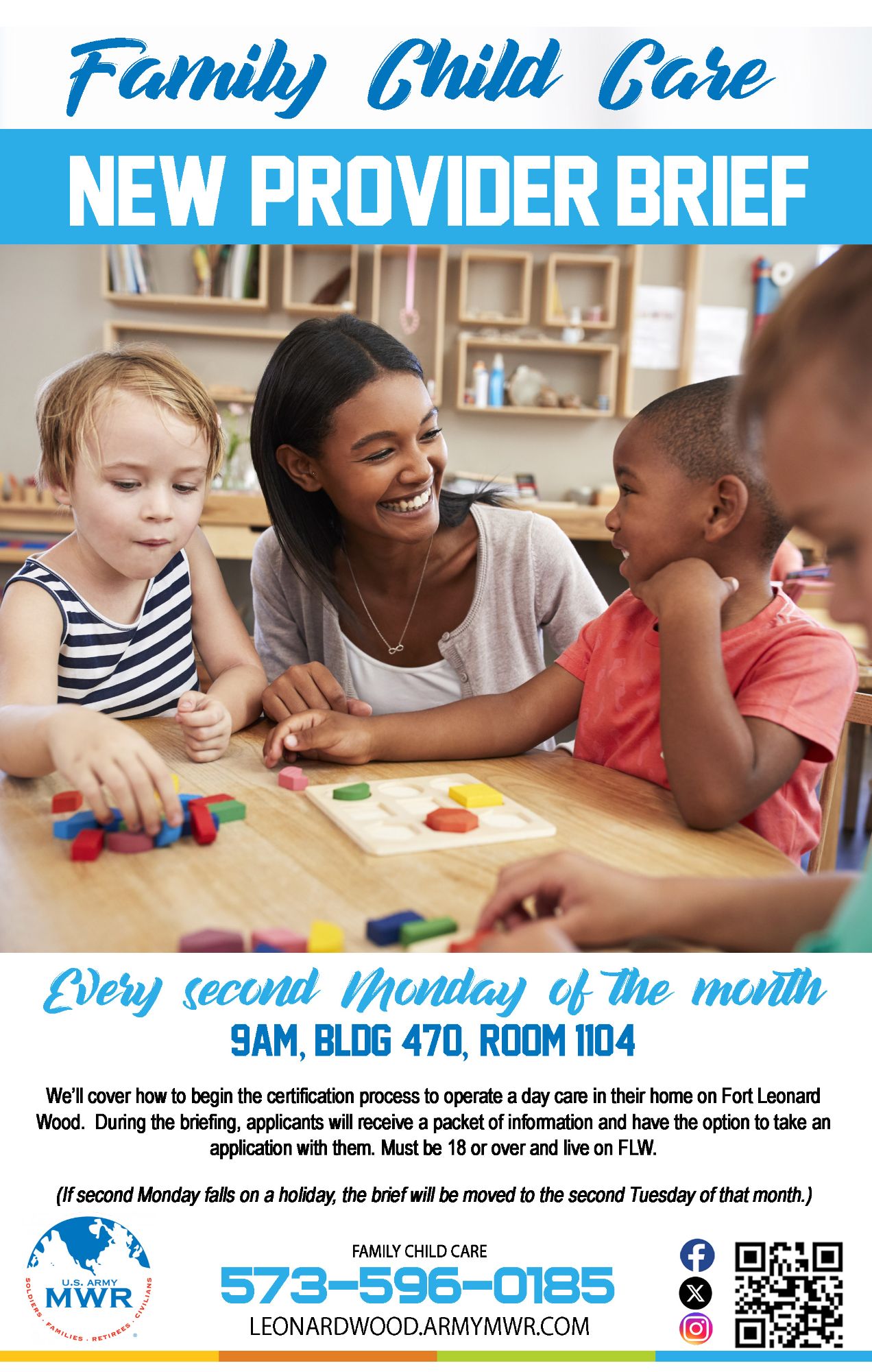We will cover how to begin the certification process to operate a day care in their home on Fort Leonard Wood. During the briefing, applicants will receive a packet of information and have the option to take an application with them.