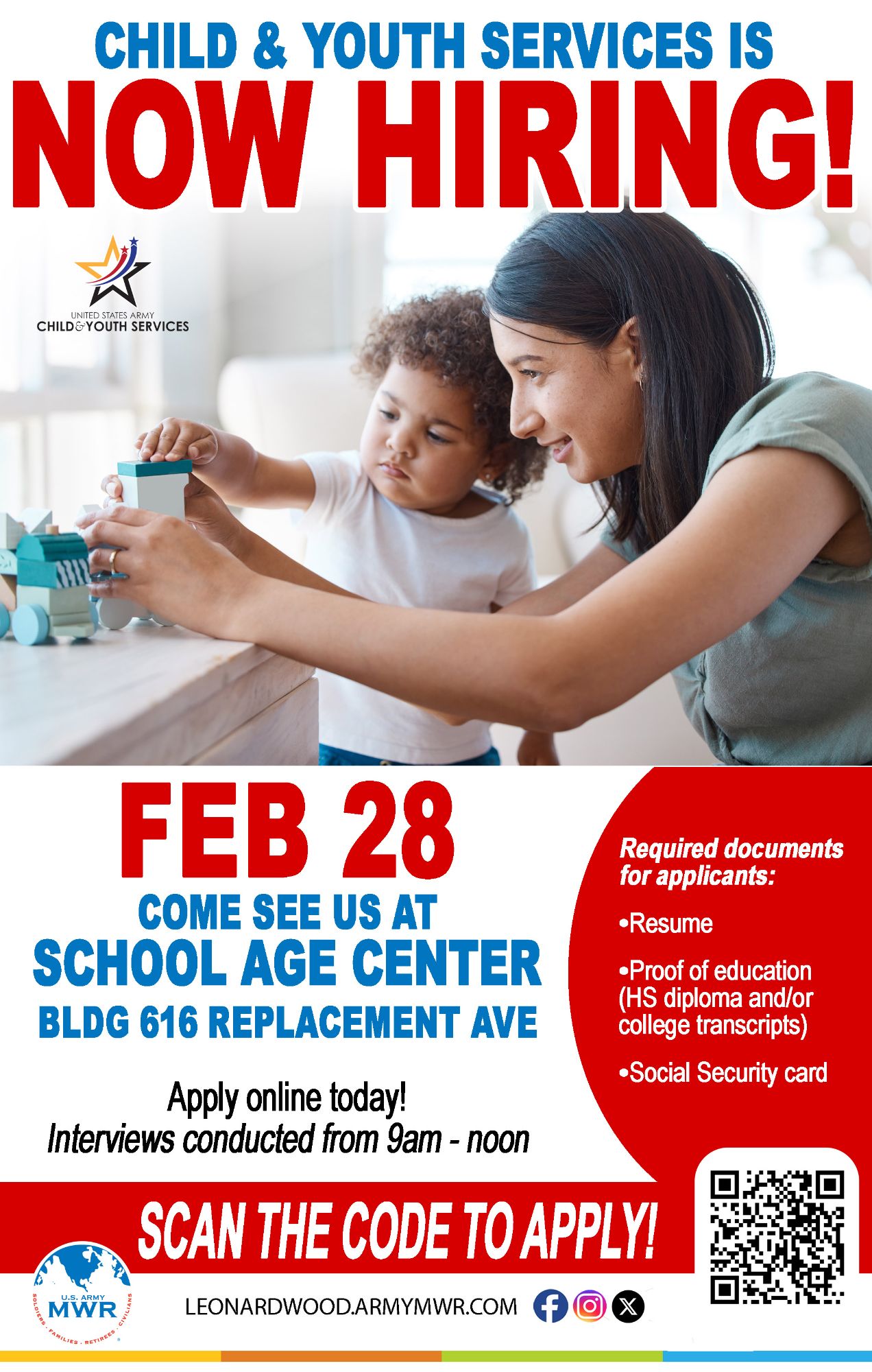 The Hiring Fair will be held at the School Age Center, Bldg 616.