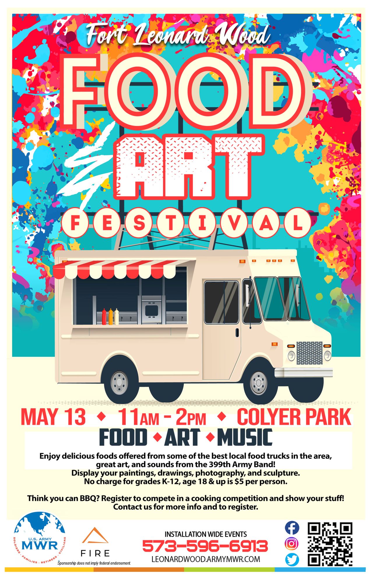 Enjoy delicious foods offered from some of the best local food trucks in the area, great art, and musical entertainment from the 399th Army Band!