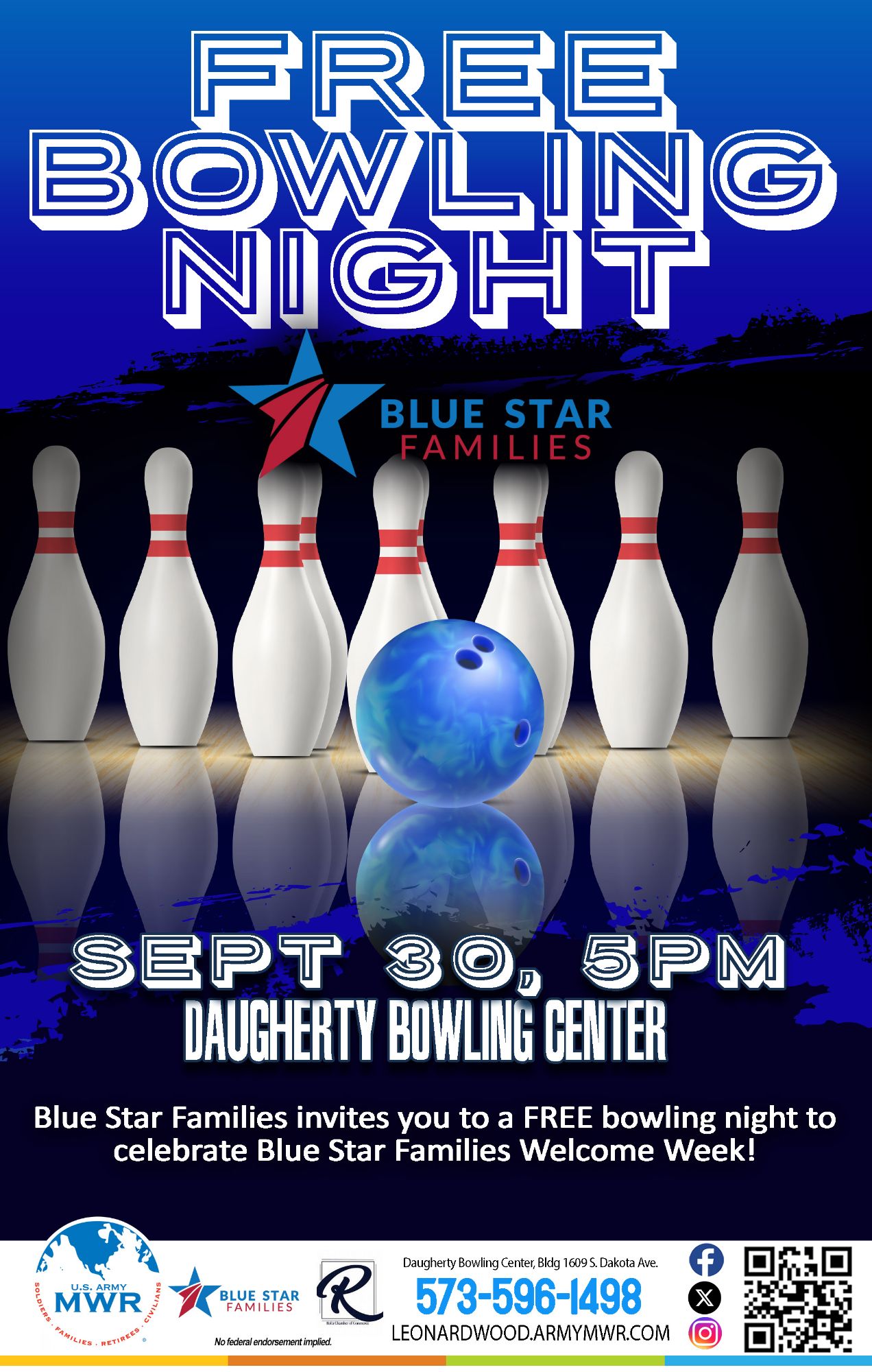 Blue Star Families invites you to a FREE bowling night at Daugherty Bowling Center to celebrate Blue Star Families Welcome Week!
