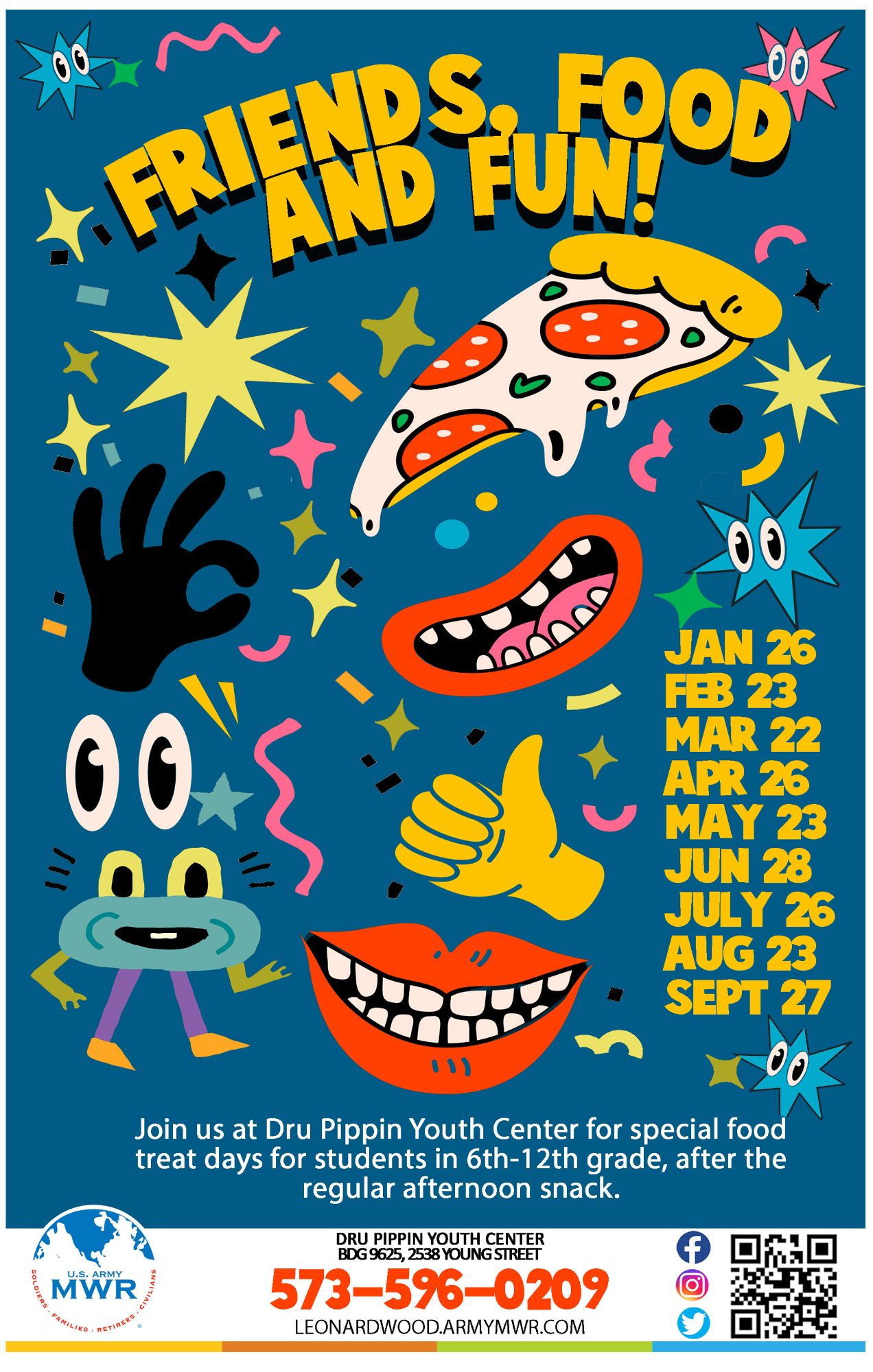 Join us at Dru Pippin Youth Center every month for Friends, Food, & Fun!