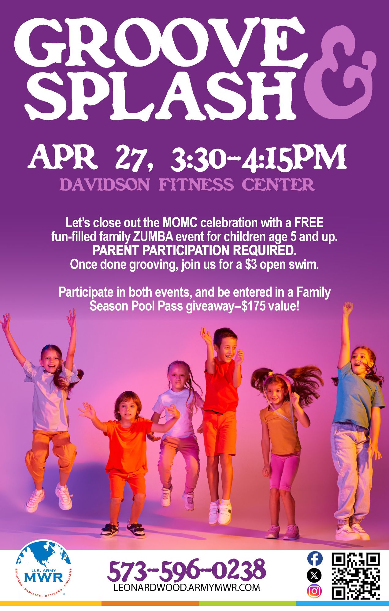 Let's close out the Month of the Military Child with a fun-filled family Zumba event for children ages 5 & up! Once your done grooving, join us for Open Swim beginning at 5 pm!