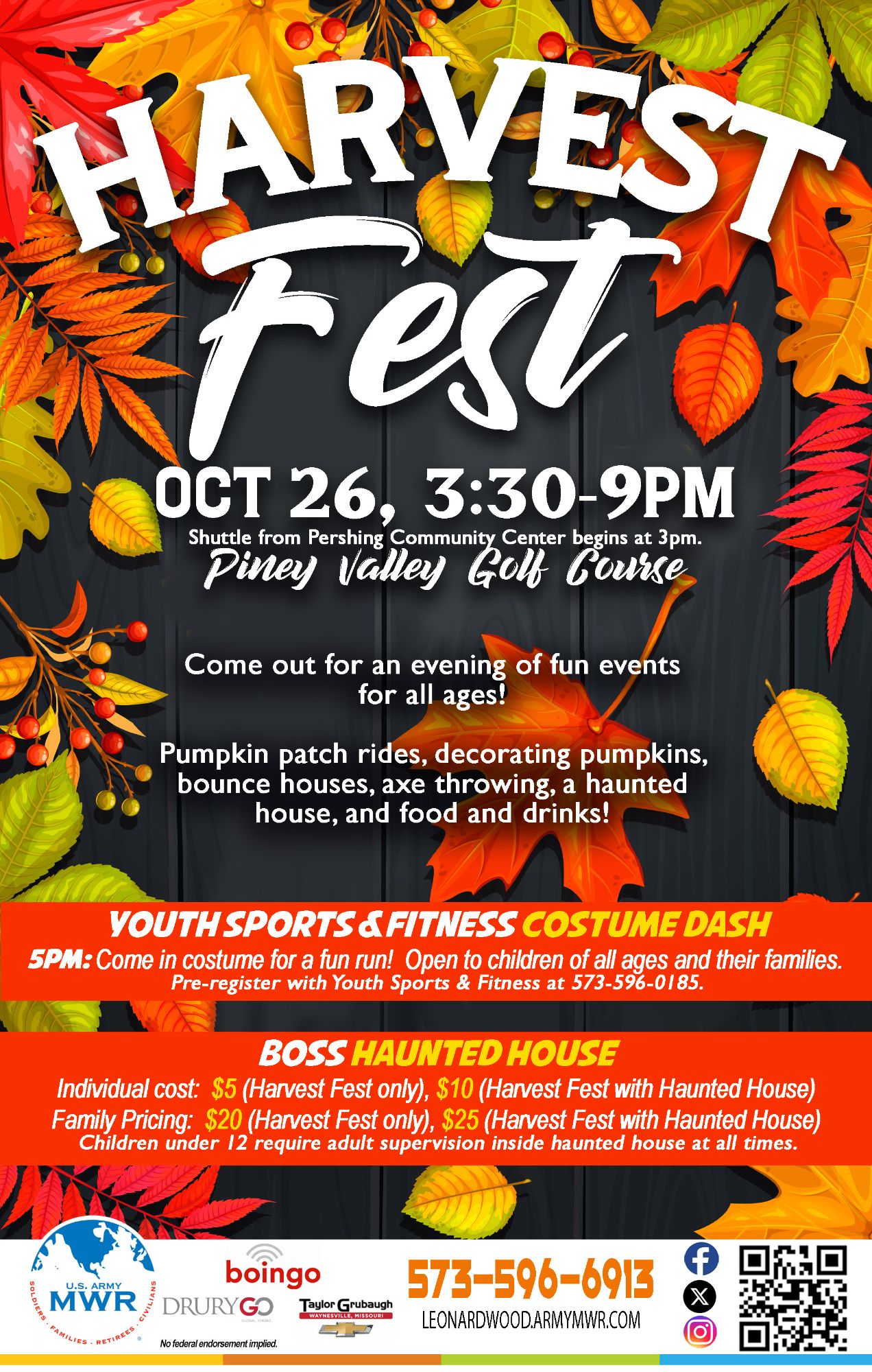 Join us for a spooky good time at Harvest Fest! Come by Piney Valley Golf Course for pumpkin patch rides, pumpkin decorating, bounce houses, axe throwing, haunted house, and food & drinks!