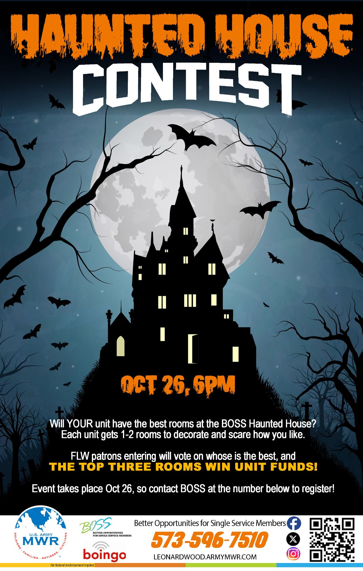 Calling all units! Compete in the BOSS Haunted House Contest for your chance to win unit funds! Will YOUR unit have the best room in the Haunted House? Each unit gets 1-2 rooms to decorate and scare how you like.