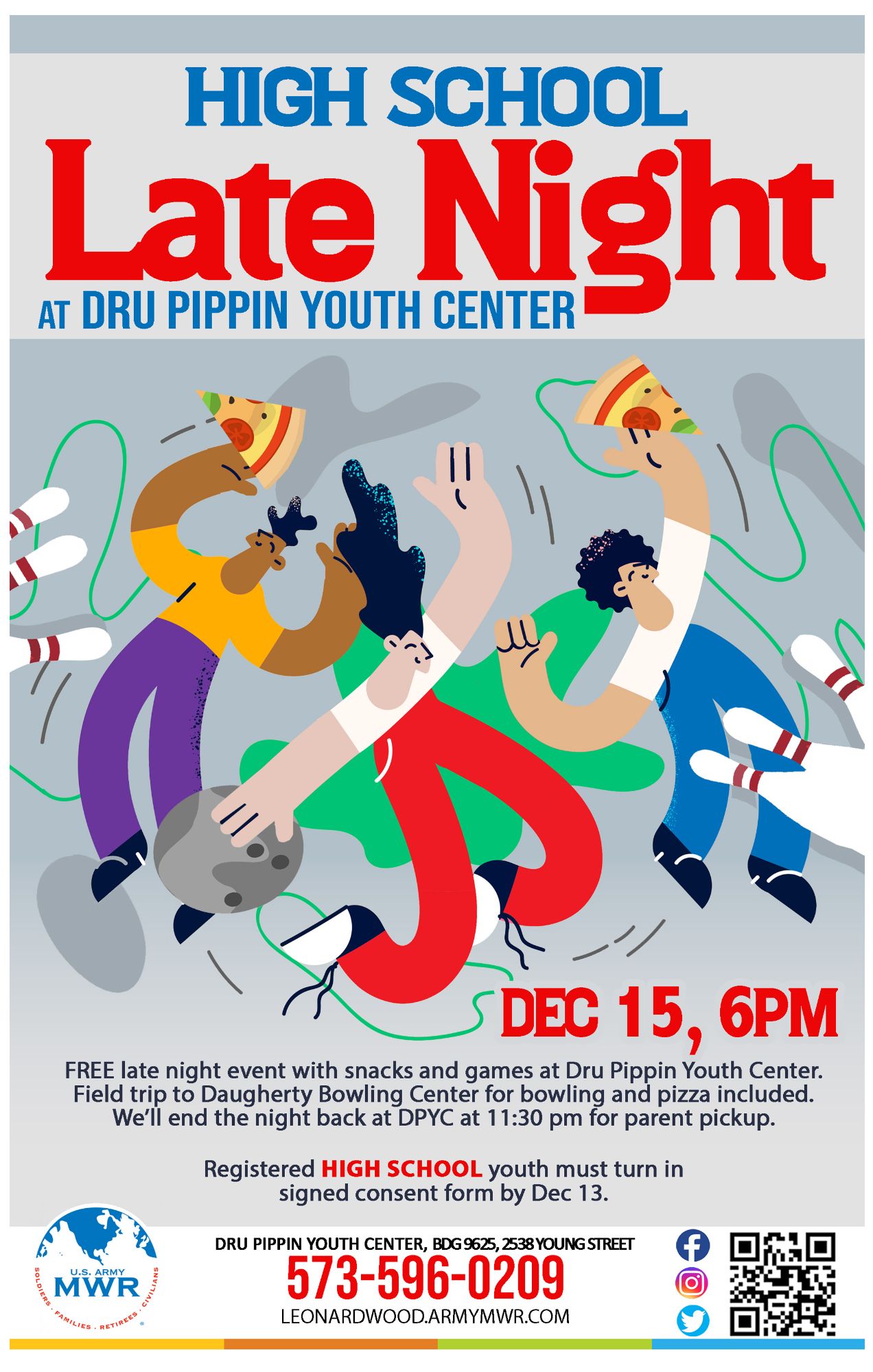 High Schoolers! Join us for a late night event at Dru Pippin Youth Center with snacks and games. Plus a field trip to Daugherty Bowling Center for bowling & pizza!