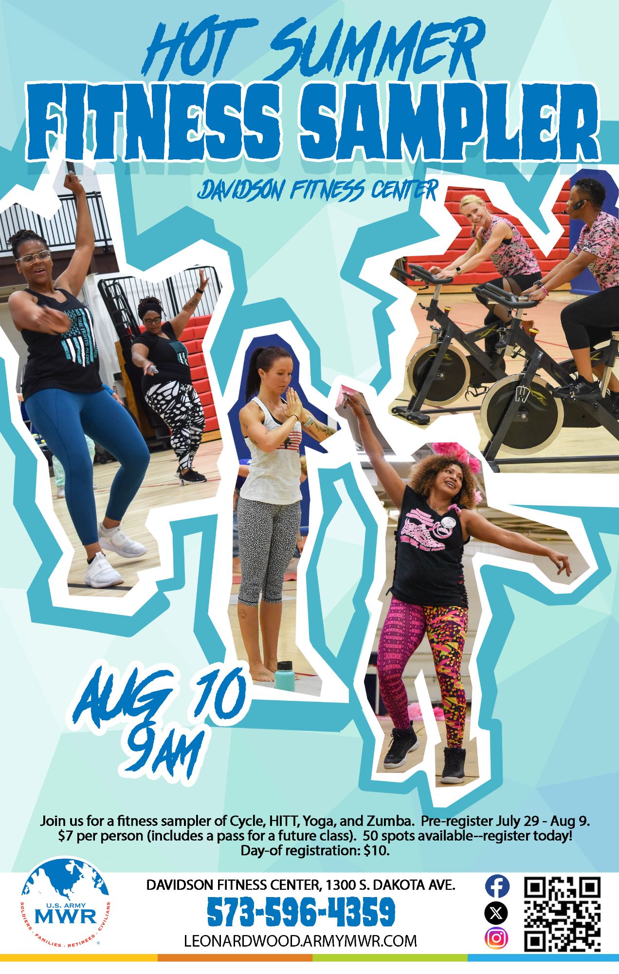 The Hot Summer Fitness Sampler will include Cycle, HIIT, Yoga, and Zumba.