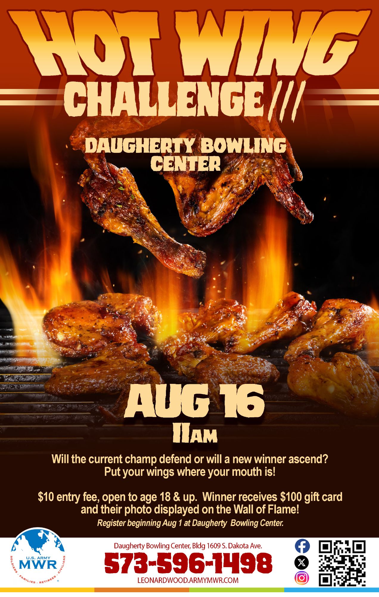 Will the current champ defend or will a new winner ascend? Put your wings where your mouth is in Daugherty Bowling Center's Hot Wing Challenge!