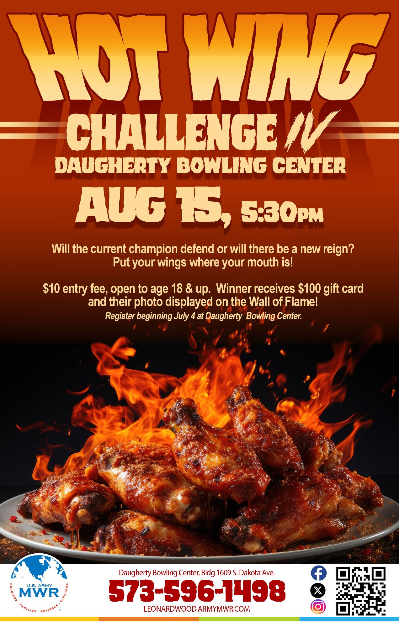 Will the current champion defend their title or will there be a new reign? Put your wings where your mouth is during our Hot Wing Challenge at Daugherty Bowling Center.