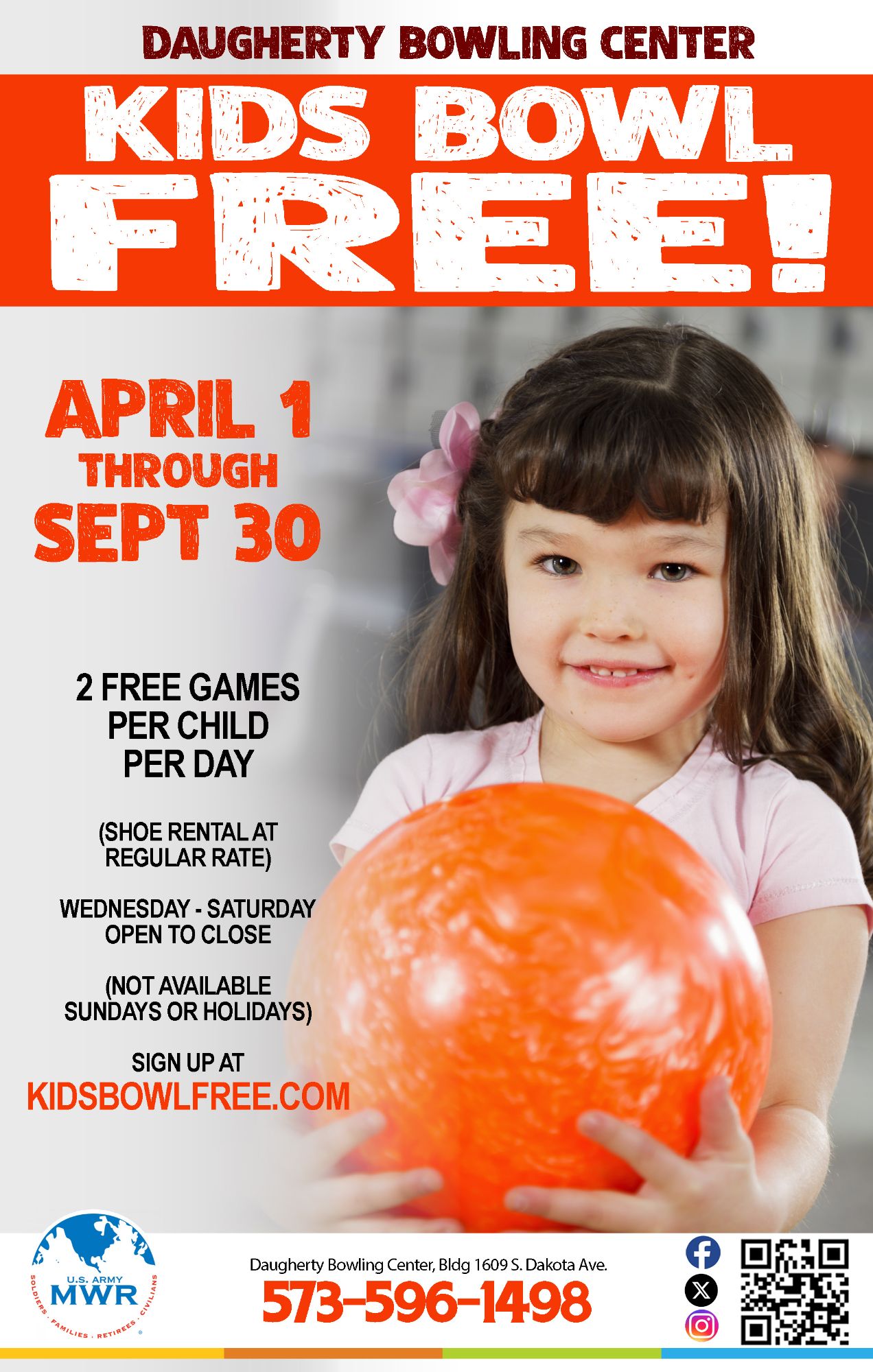 Kids Bowl FREE at Daugherty Bowling Center from April - September.