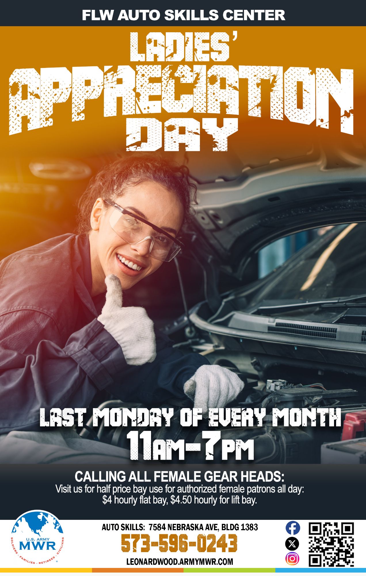 Calling all female gear heads! Visit Auto Skills Center for half price bay use for authorized female patrons all day!