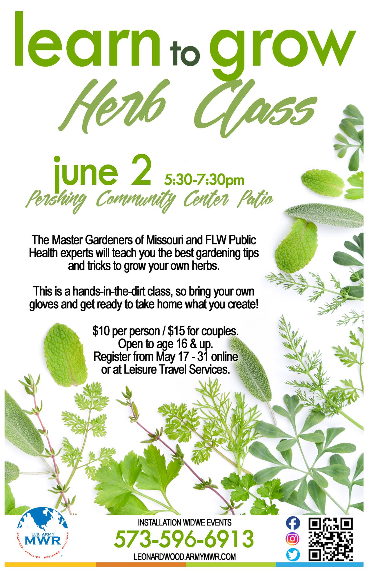 Register Now!The Learn to Grow Herb Class will be held at the Pershing Community Center Patio.